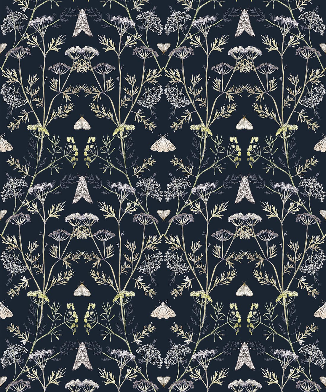 The botanical Queen Anne’s Lace wallpaper in calming colorways merges the delicate beauty of wild carrot flowers with the enchanting flutter of butterflies and moths. The soft hues of muted greens, blues and neutrals evokes a sense of peaceful serenity, while the intricately detailed flowers dance across the wallpaper, creating a mesmerizing pattern that brings a touch of nature indoors. Let the delicate charm of this beautiful wallpaper transform your surroundings into a tranquil retreat, where the beauty of nature and the grace of fluttering creates come together in perfect harmony.