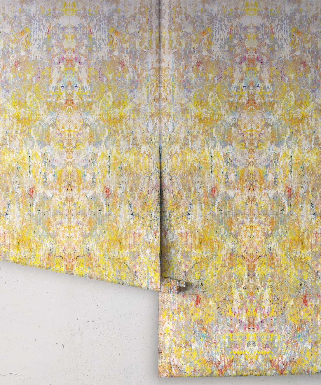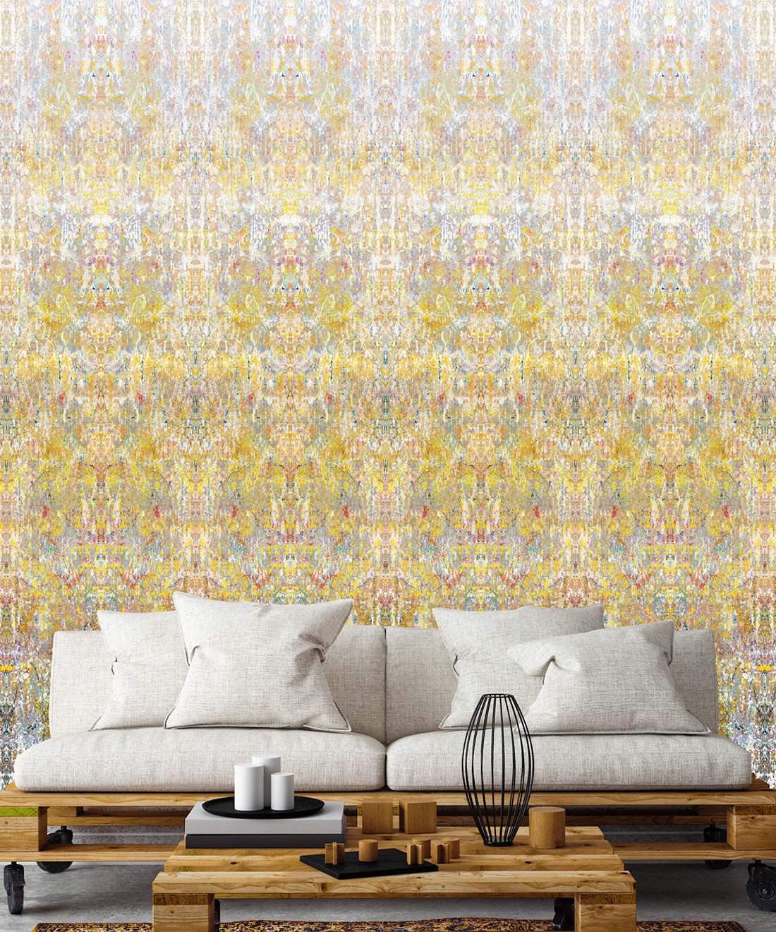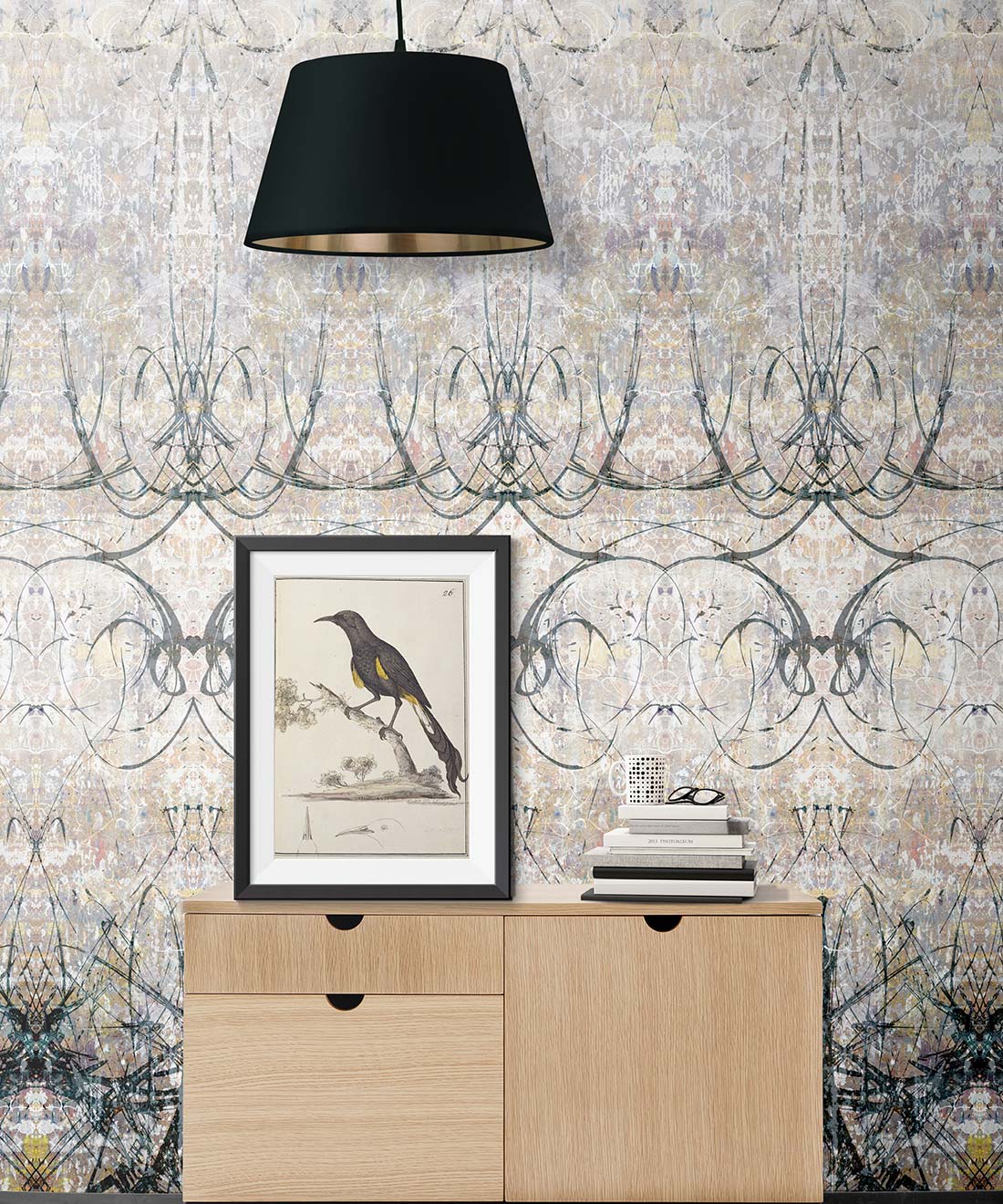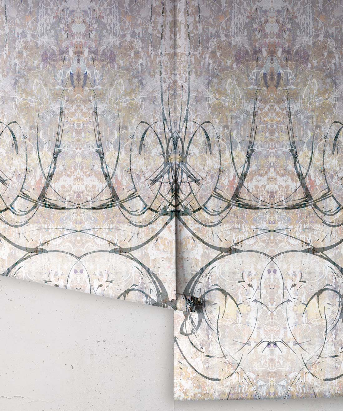 Ramose wallpaper vibrates with color and energy. It features complex colors and delicate textures overlayed with sophisticated patterning. This elegant abstract wallpaper design becomes lighter towards the top, adding a feeling of height to any space.