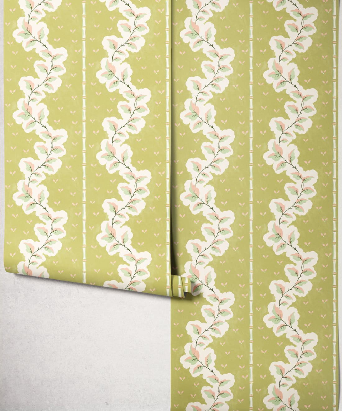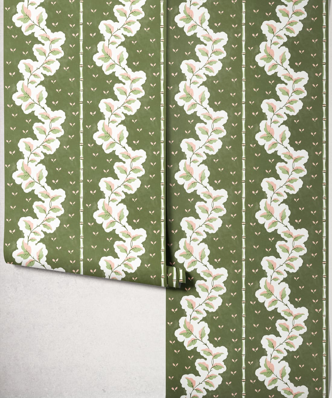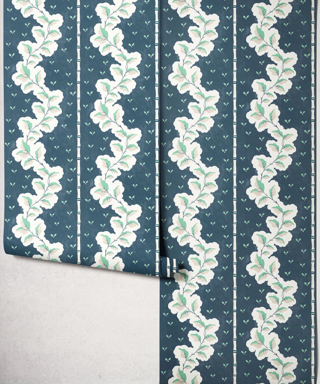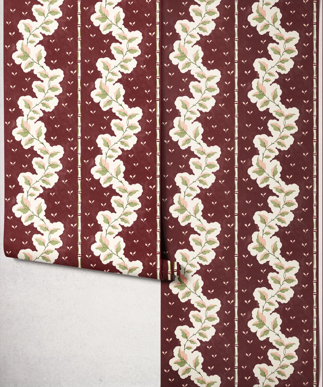 Silk Road is a hand-painted decorative stripe wallpaper that weaves foliage and pattern into a richly detailed design. Leaves and floral motifs flow through the stripe, giving the pattern movement and texture.
