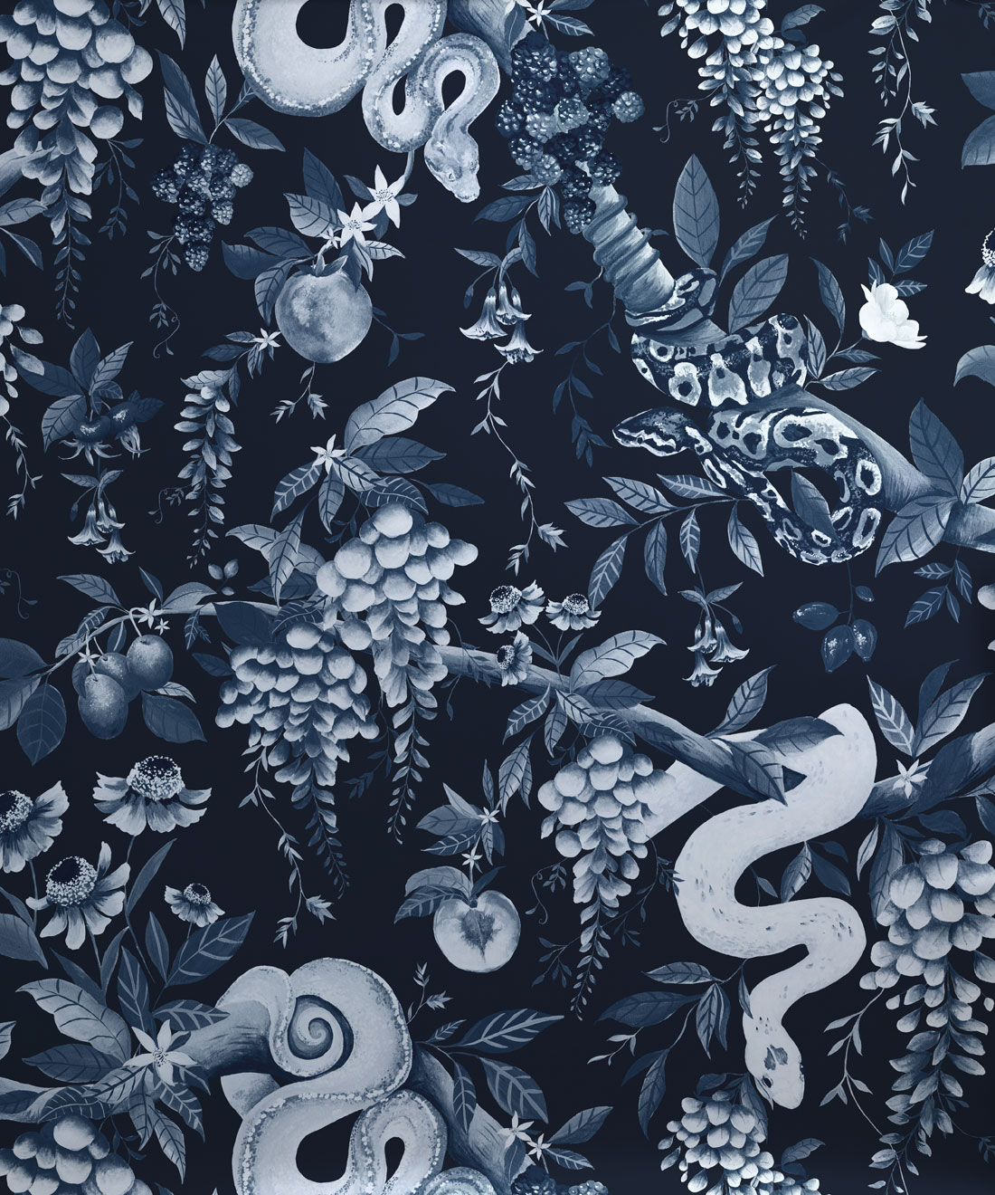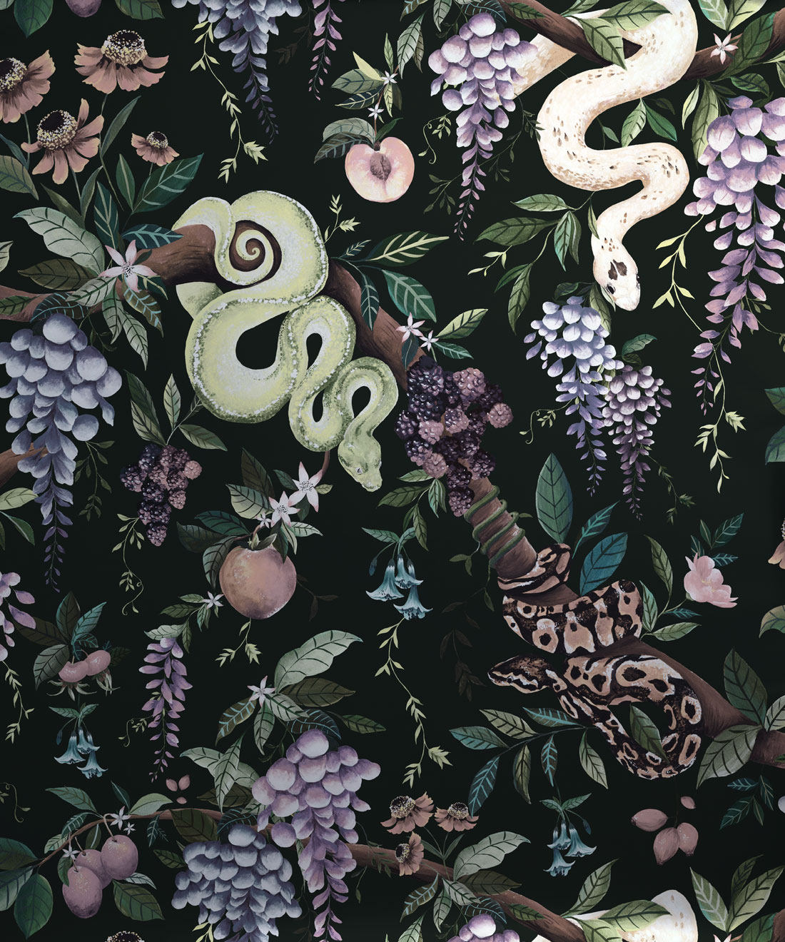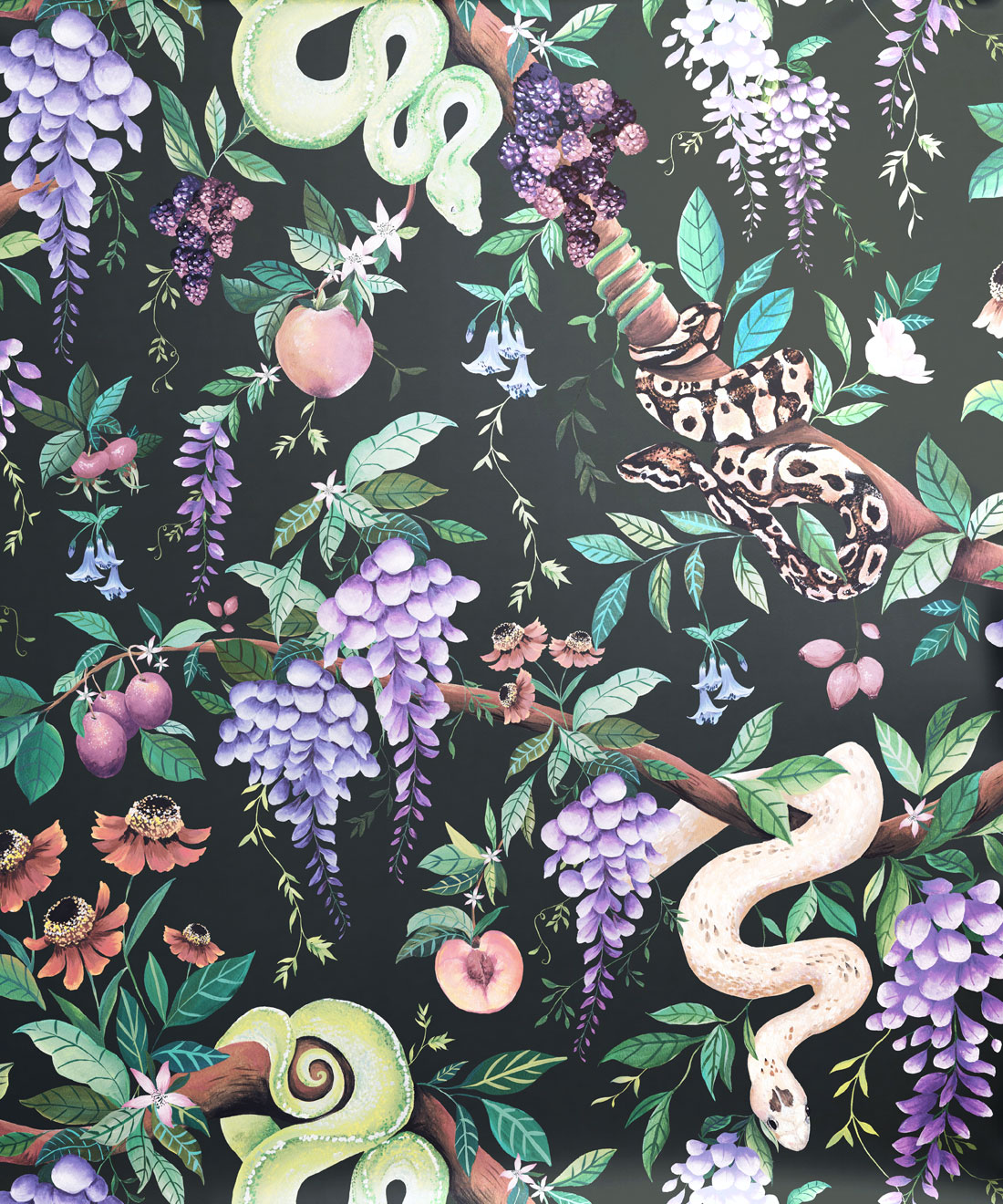 Snake Charmer is a sultry and intricate metallic wallpaper that weaves together snakes, fruits and florals in a rich maximalist repeat. Hand painted in gouache, the design balances the ethereal presence of the serpent with lush botanicals. Finished with silver metallic detailing, Snake Charmer celebrates the dark, decadent side of nature with mesmerising depth.
