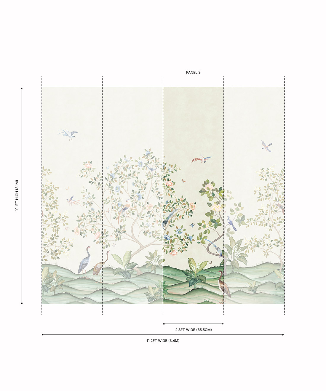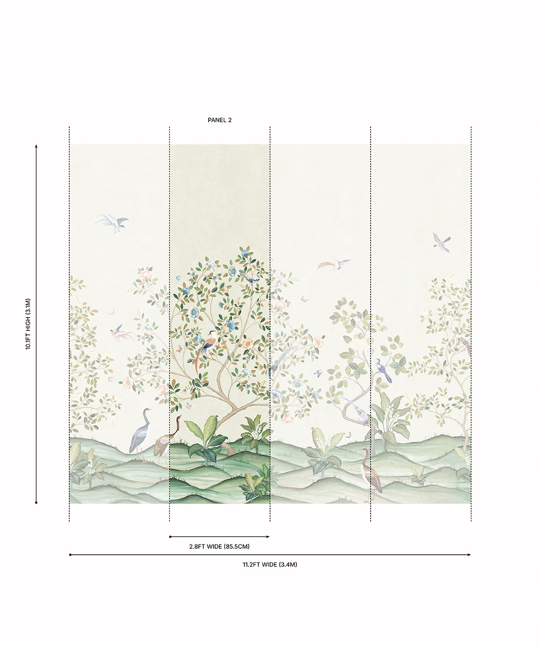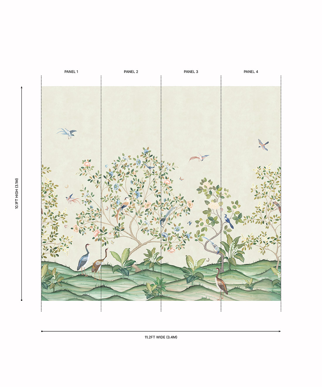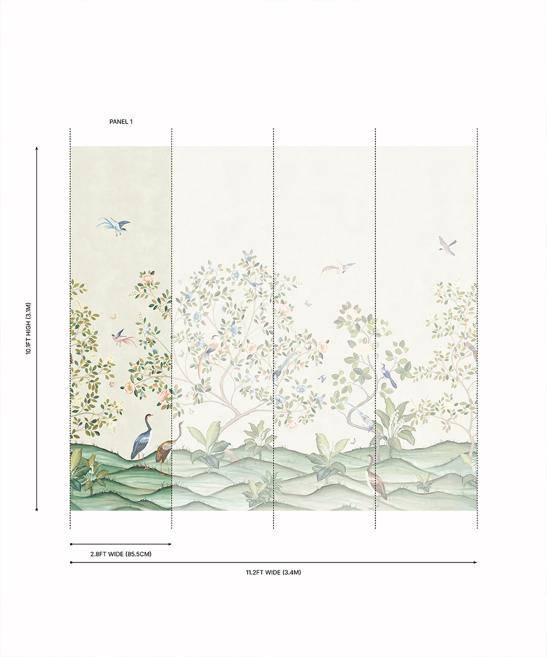 The Spring Landscape Mural from Bethany Linz is a Chinoiserie-style design originally hand-painted in gouache on stone henge paper. Inspired by a commissioned piece, this mural gave the artist the opportunity to create a vibrant botanical scene featuring birds, butterflies, and flowering trees. The design is available as a four-panel composition, sold either as a full set or as individual panels, and captures the height of spring when nature is alive with movement and bloom. This graceful mural offers a whimsical and floral backdrop, perfect for bedrooms, open living spaces, or children’s playrooms.