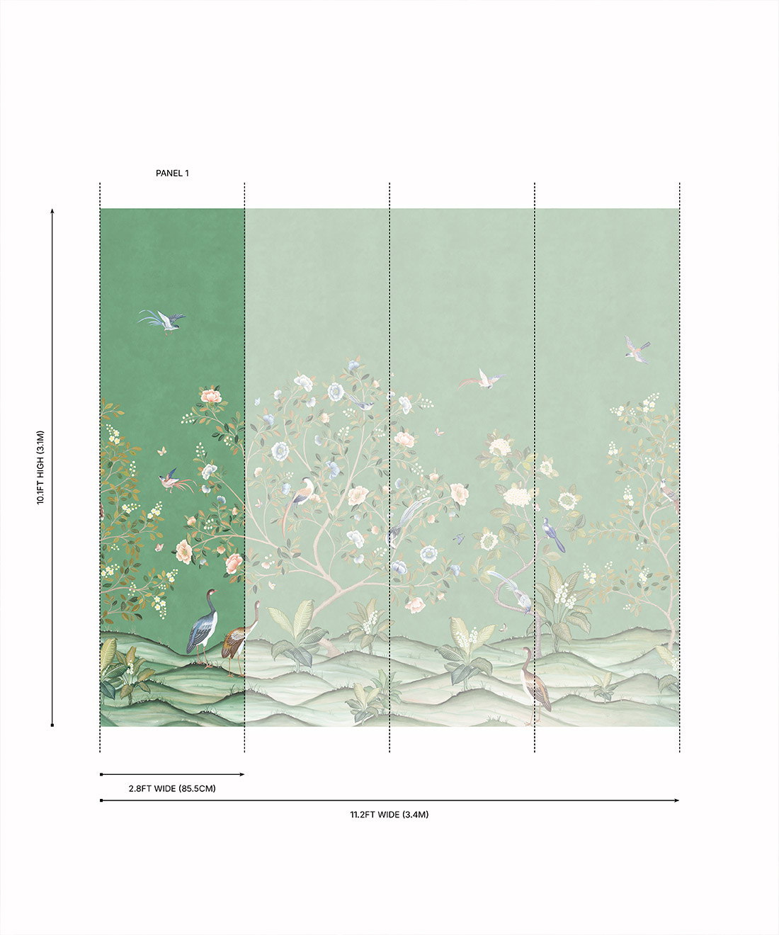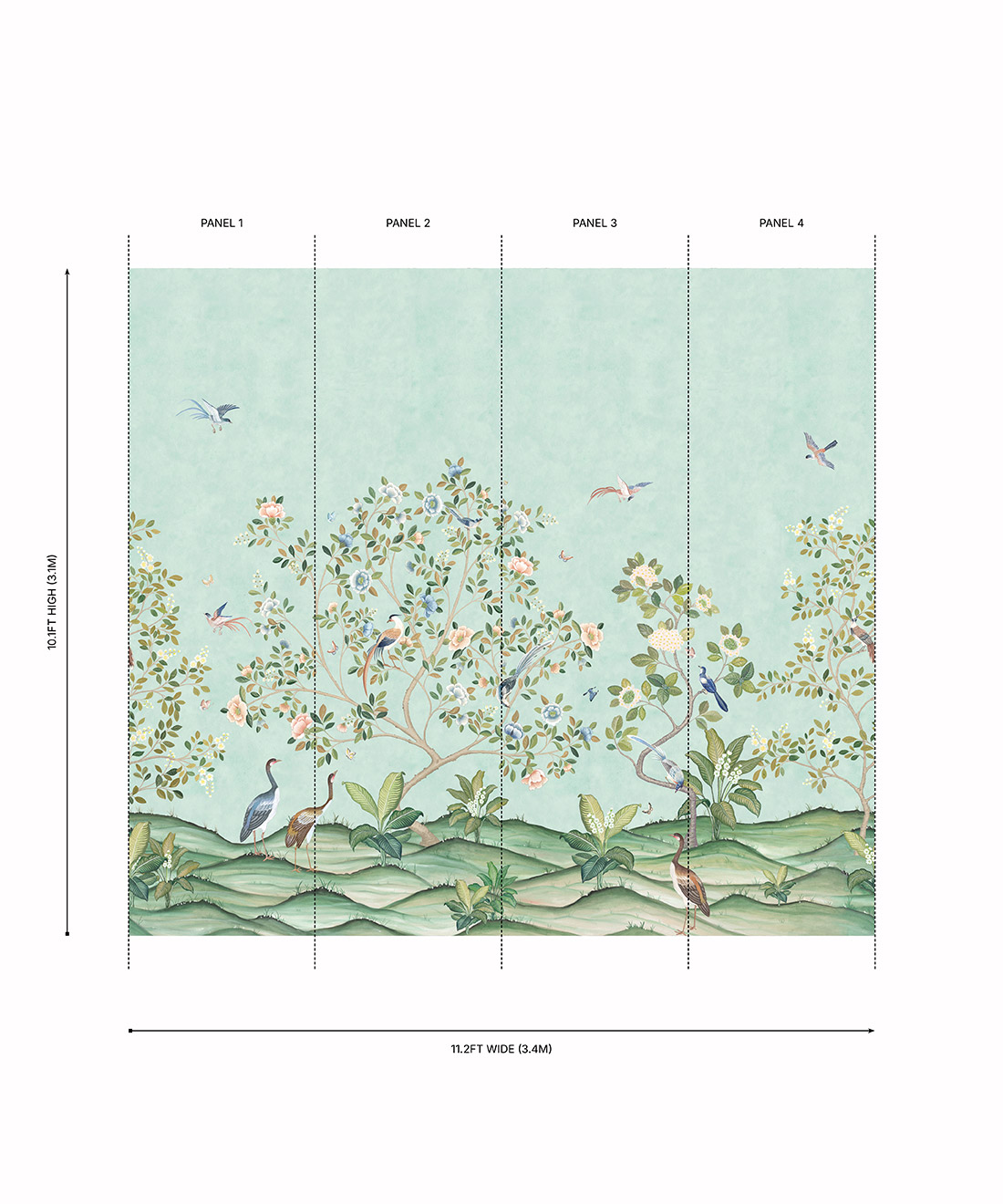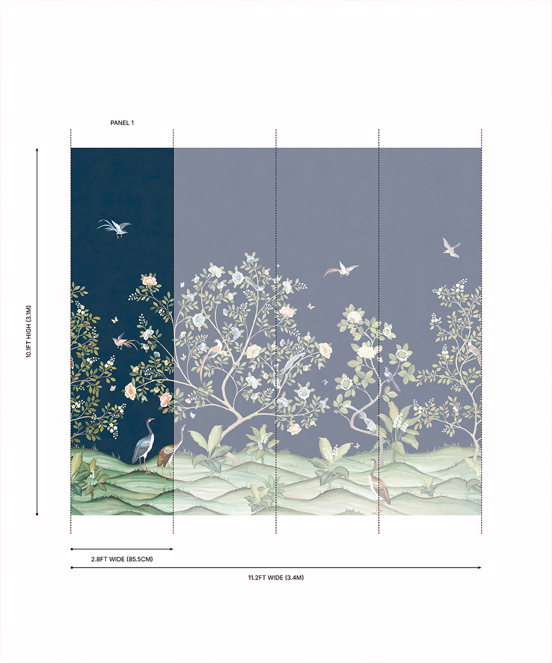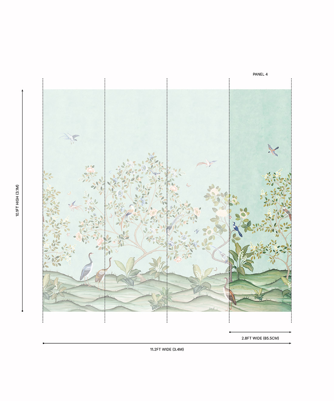 The Spring Landscape Mural from Bethany Linz is a Chinoiserie-style design originally hand-painted in gouache on stone henge paper. Inspired by a commissioned piece, this mural gave the artist the opportunity to create a vibrant botanical scene featuring birds, butterflies, and flowering trees. The design is available as a four-panel composition, sold either as a full set or as individual panels, and captures the height of spring when nature is alive with movement and bloom. This graceful mural offers a whimsical and floral backdrop, perfect for bedrooms, open living spaces, or children’s playrooms.
