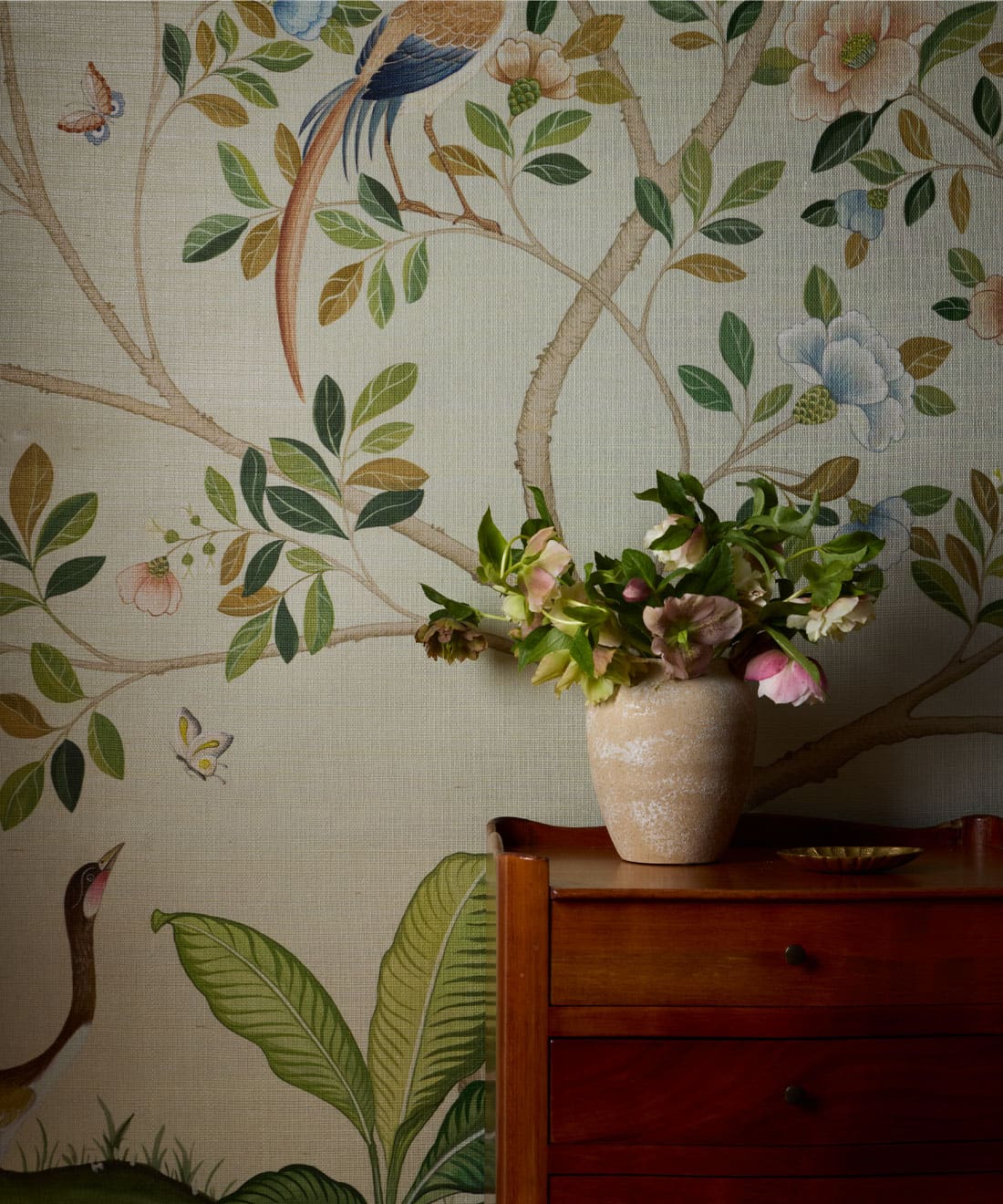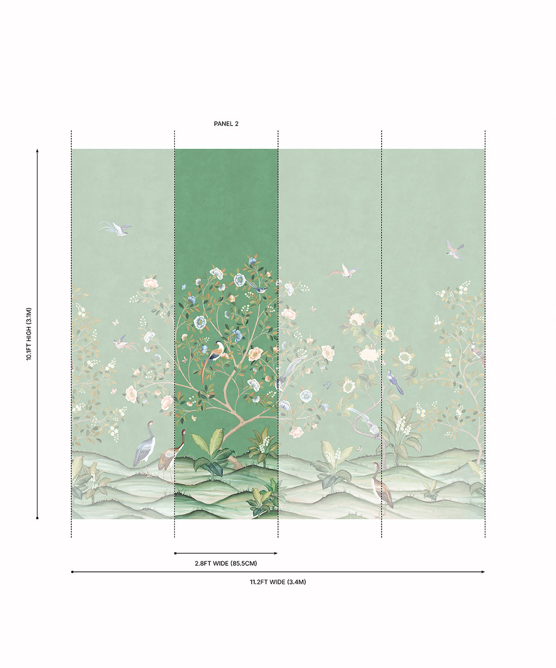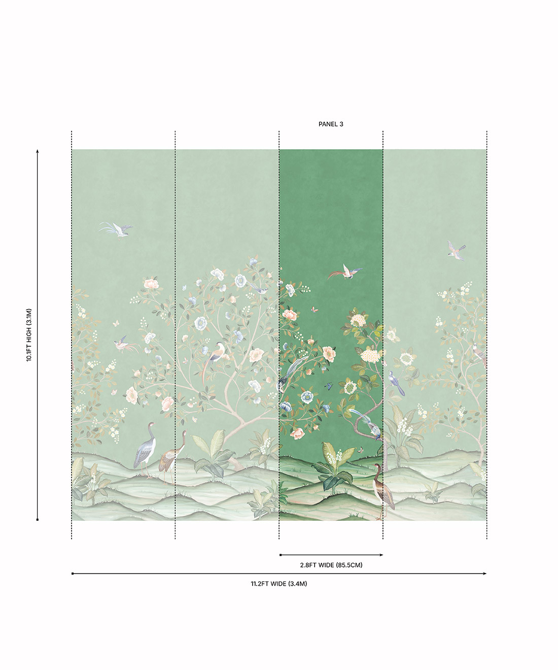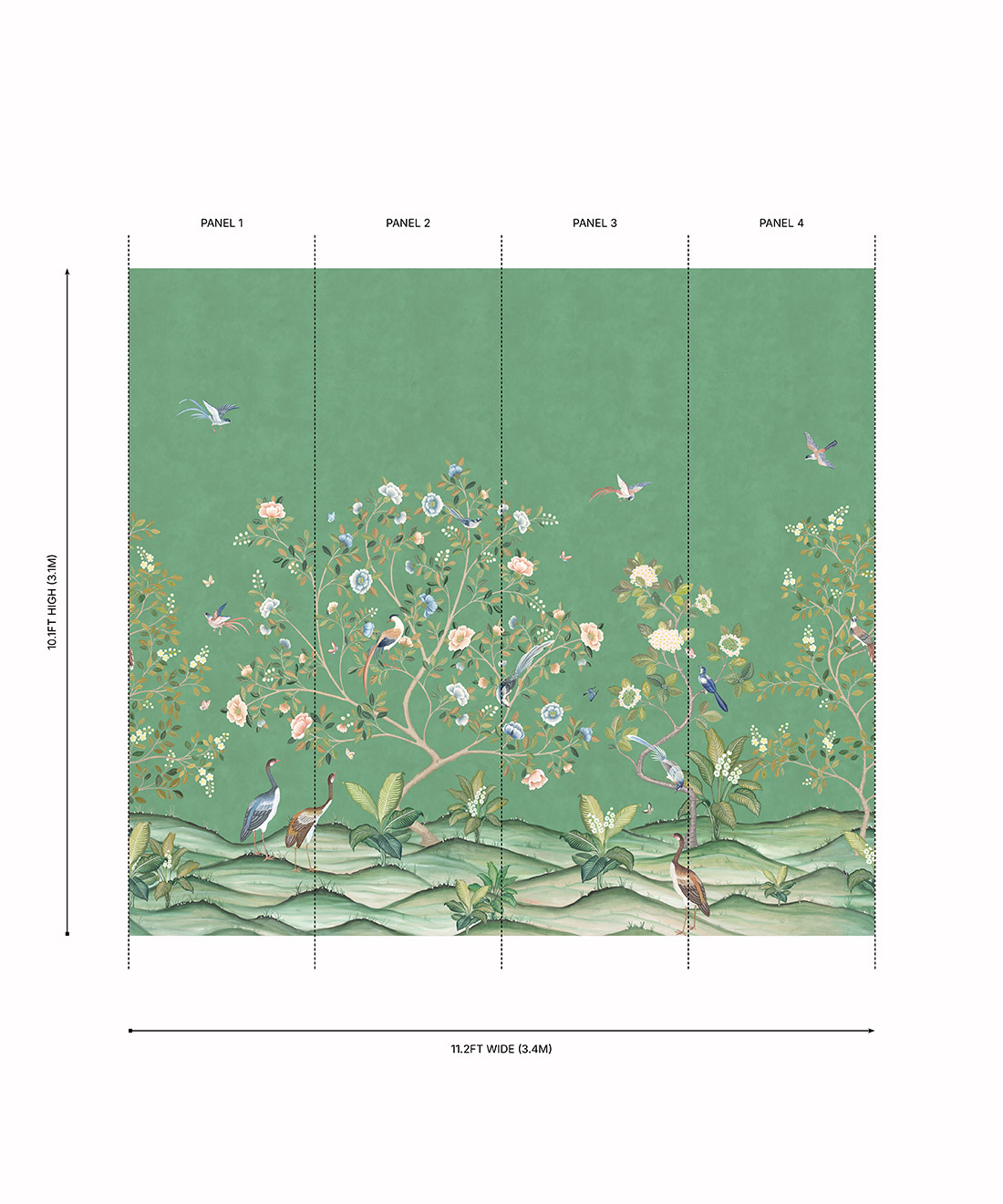 The Spring Landscape Mural from Bethany Linz is a Chinoiserie-style design originally hand-painted in gouache on stone henge paper. Inspired by a commissioned piece, this mural gave the artist the opportunity to create a vibrant botanical scene featuring birds, butterflies, and flowering trees. The design is available as a four-panel composition, sold either as a full set or as individual panels, and captures the height of spring when nature is alive with movement and bloom. This graceful mural offers a whimsical and floral backdrop, perfect for bedrooms, open living spaces, or children’s playrooms.