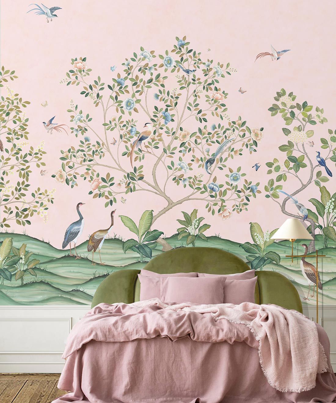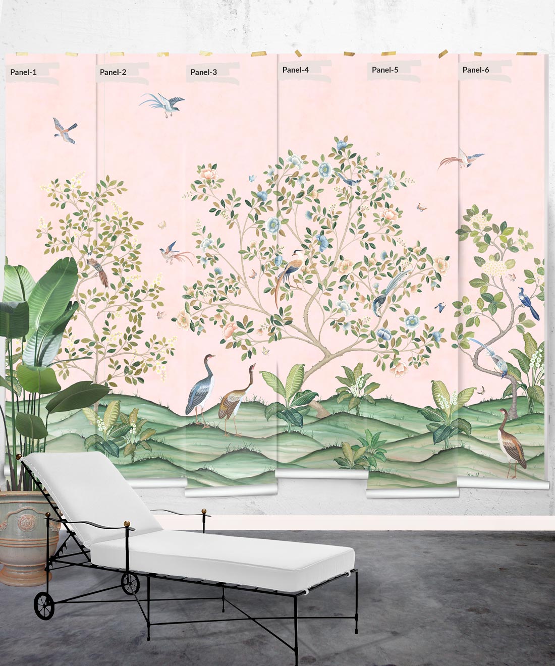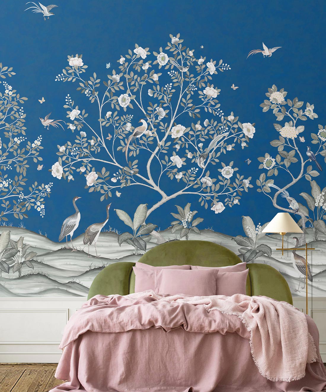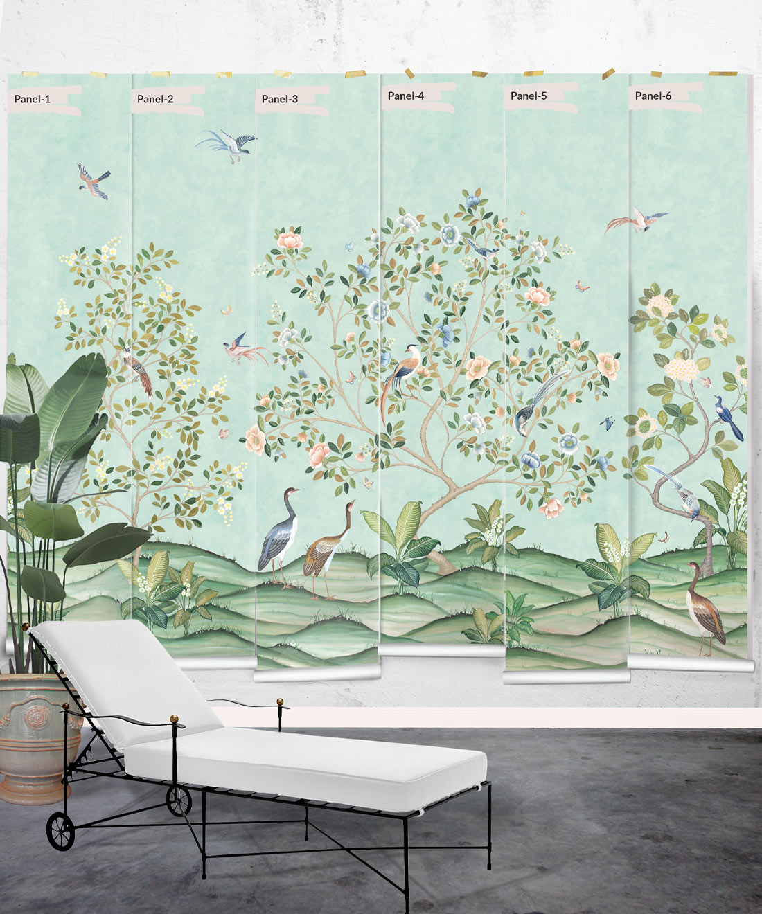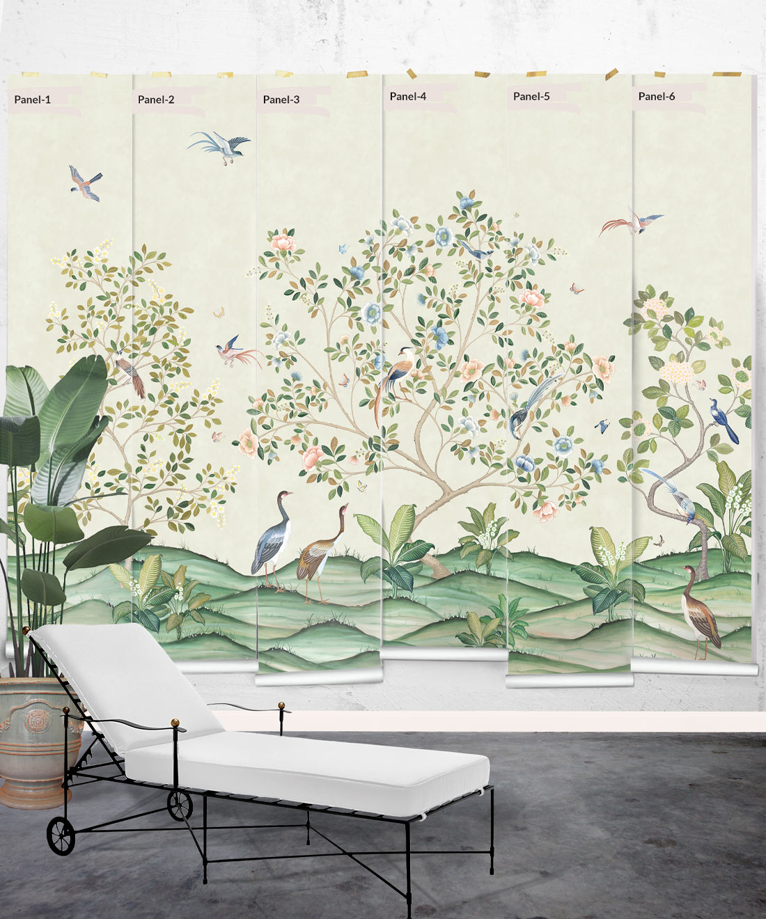 The Spring Landscape Mural from Bethany Linz is a Chinoiserie-style mural originally hand-painted in Gouache on stone henge paper. Inspired by a commission piece, the design allowed the artist to undertake a unique challenge featuring birds, butterflies, and botanicals. The six-panel mural captures the height of spring, when flowers are in full bloom and the various birds and butterflies are out to enjoy them. This design is a beautiful floral backdrop, perfect for an open living space, bedroom, or child’s playroom.