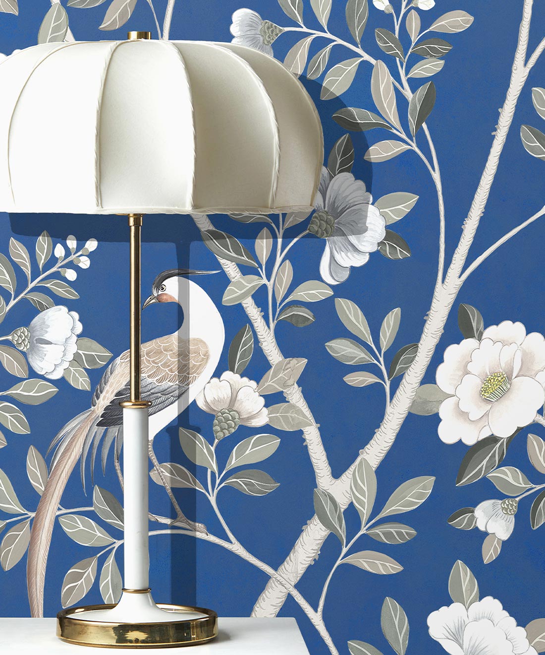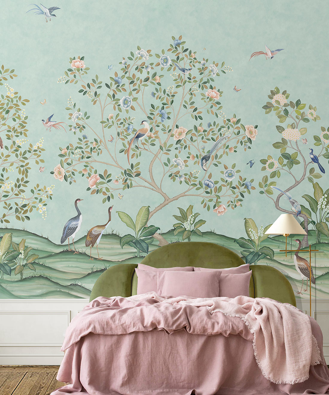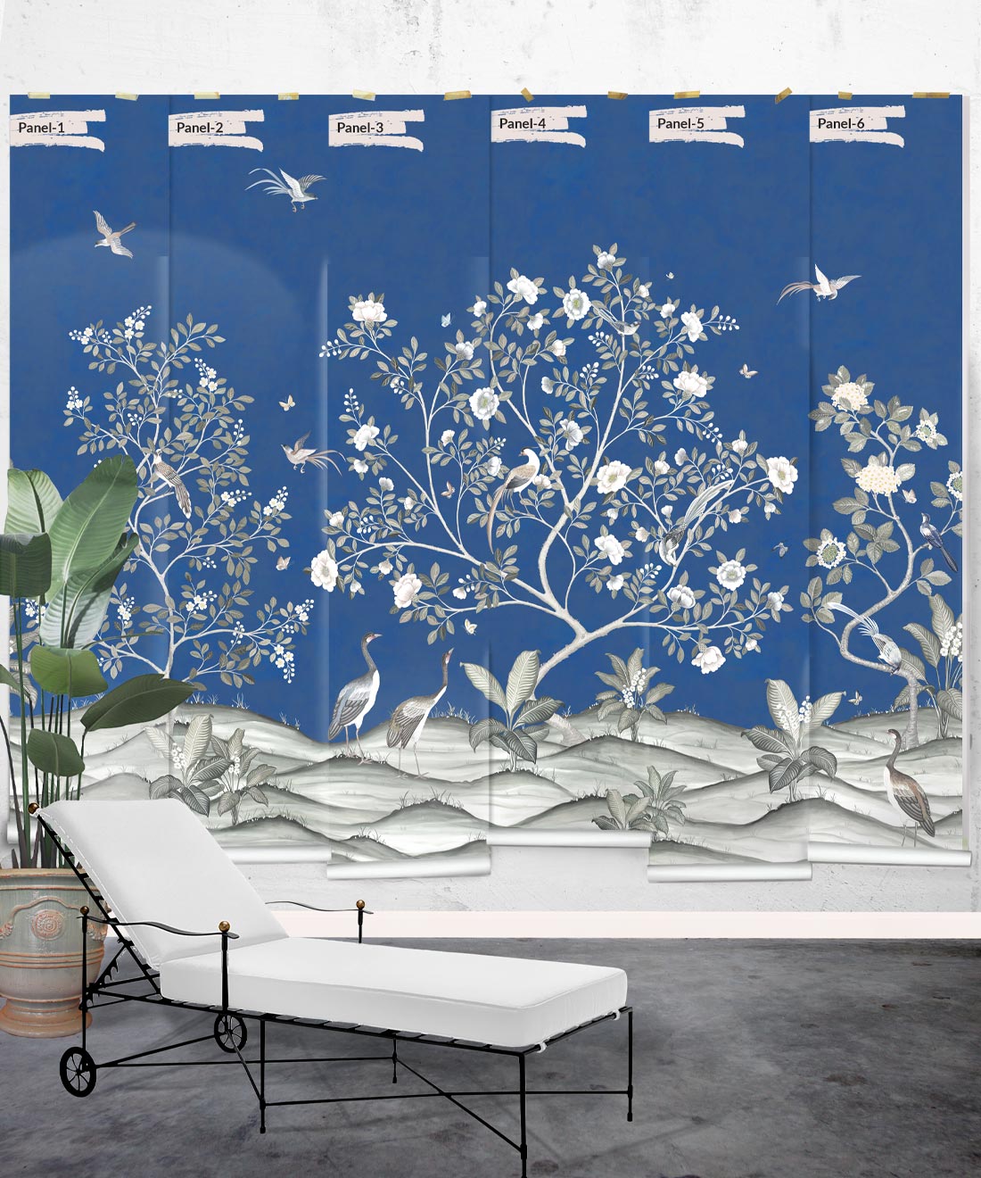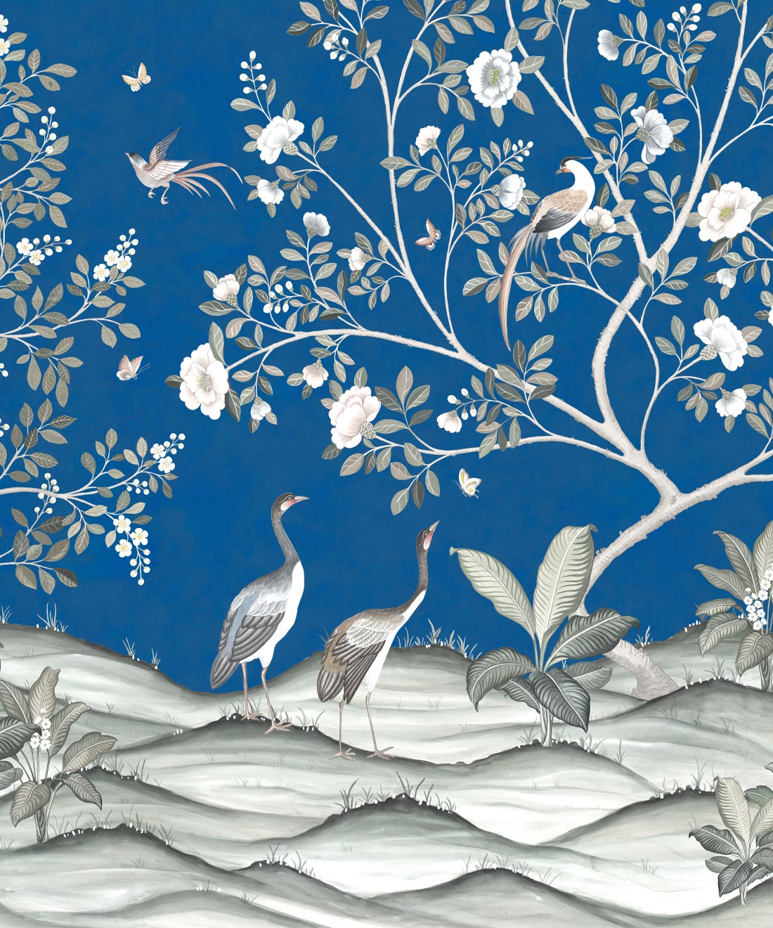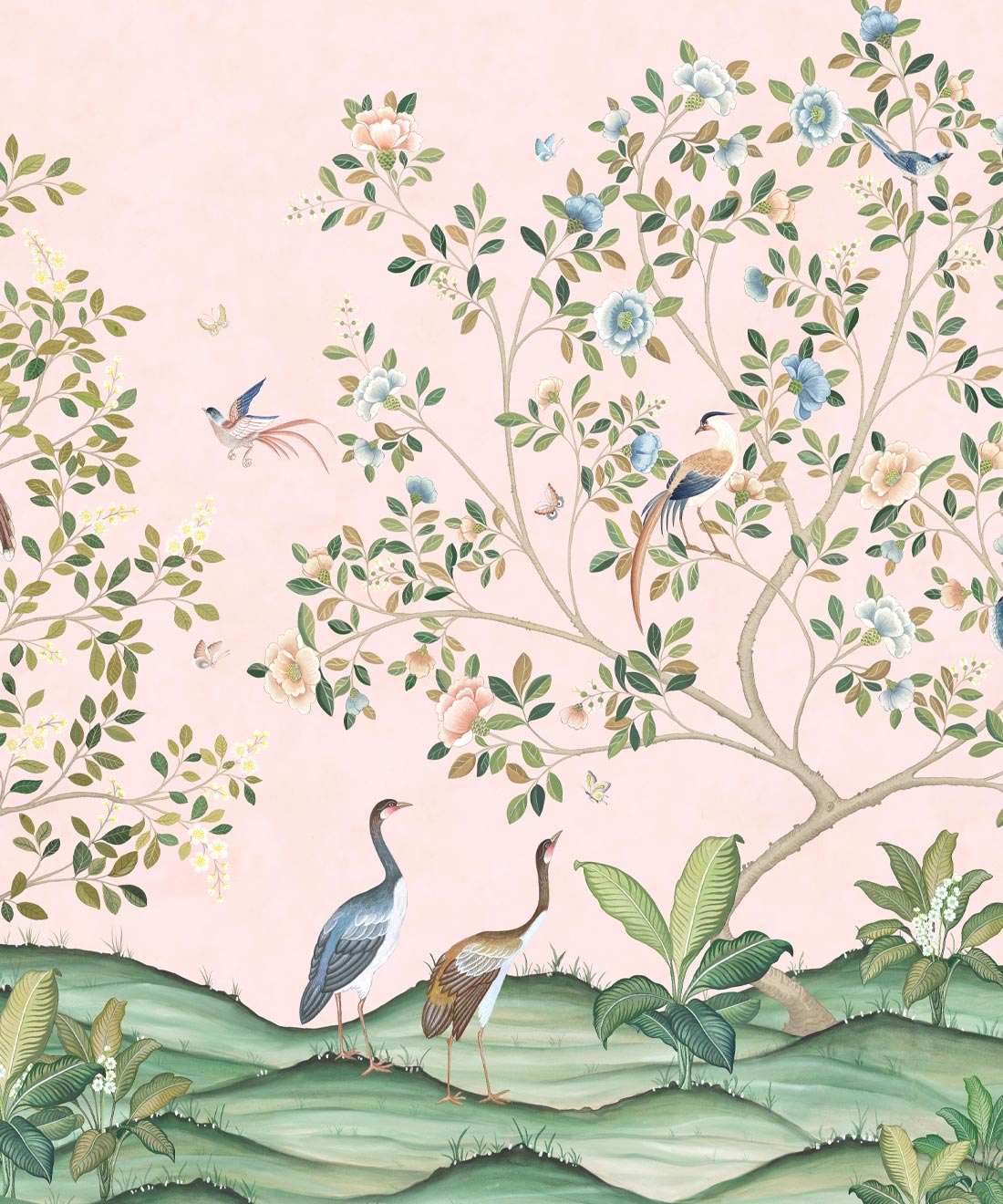 The Spring Landscape Mural from Bethany Linz is a Chinoiserie-style mural originally hand-painted in Gouache on stone henge paper. Inspired by a commission piece, the design allowed the artist to undertake a unique challenge featuring birds, butterflies, and botanicals. The six-panel mural captures the height of spring, when flowers are in full bloom and the various birds and butterflies are out to enjoy them. This design is a beautiful floral backdrop, perfect for an open living space, bedroom, or child’s playroom.