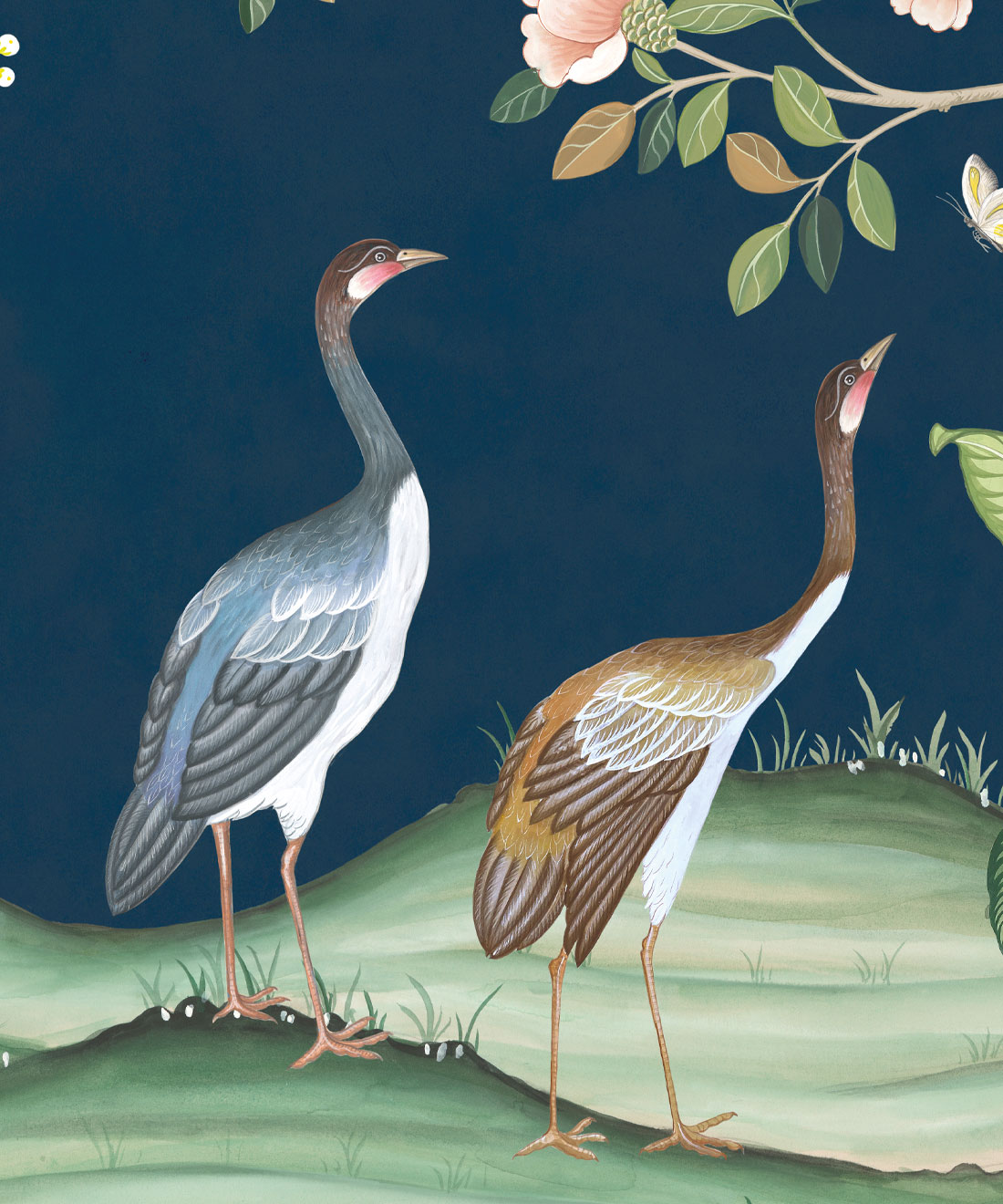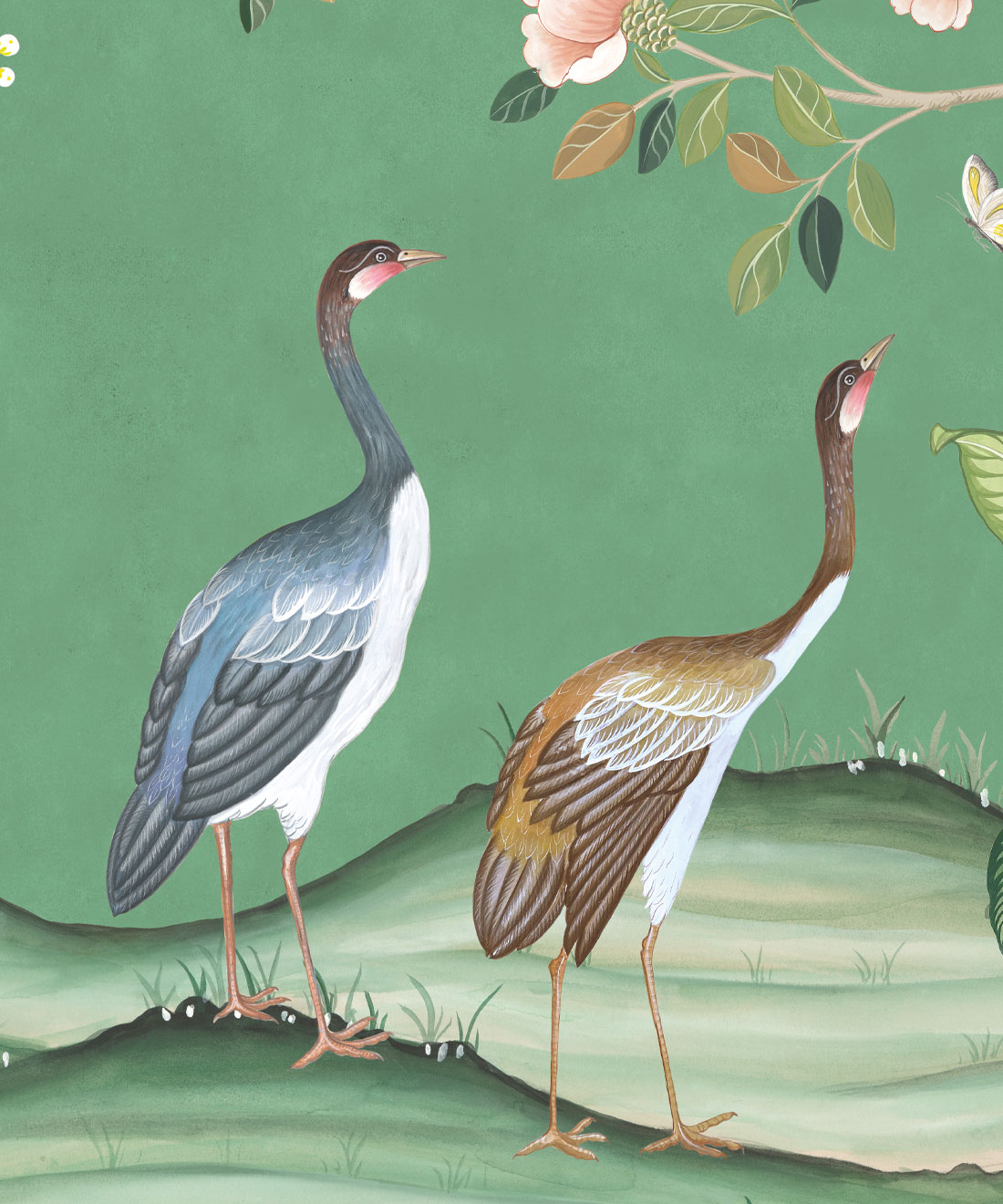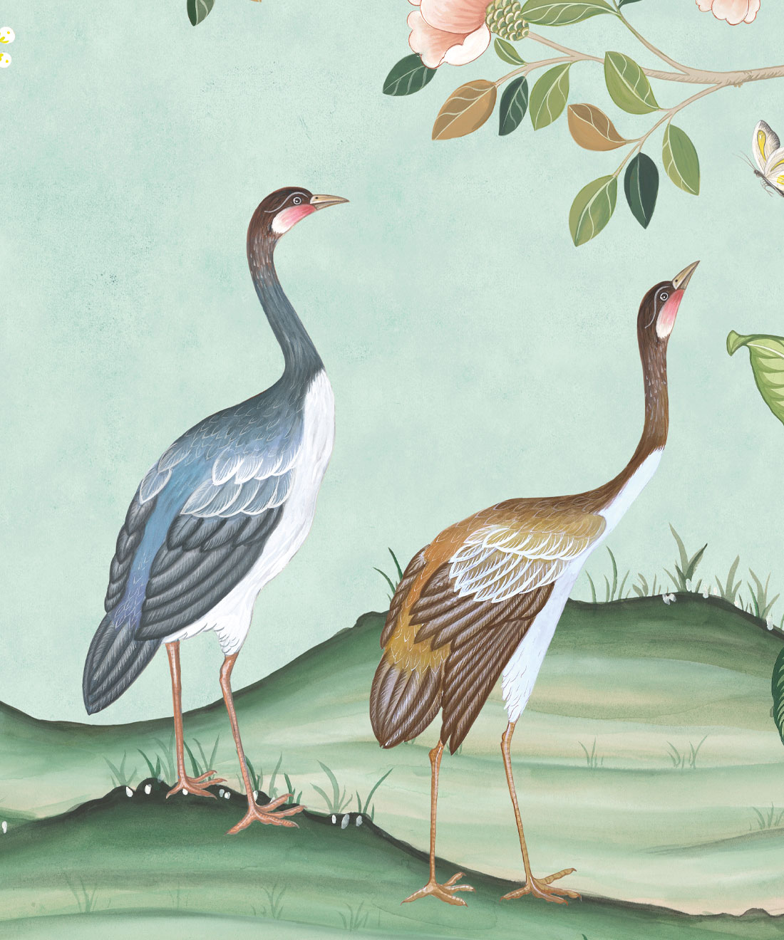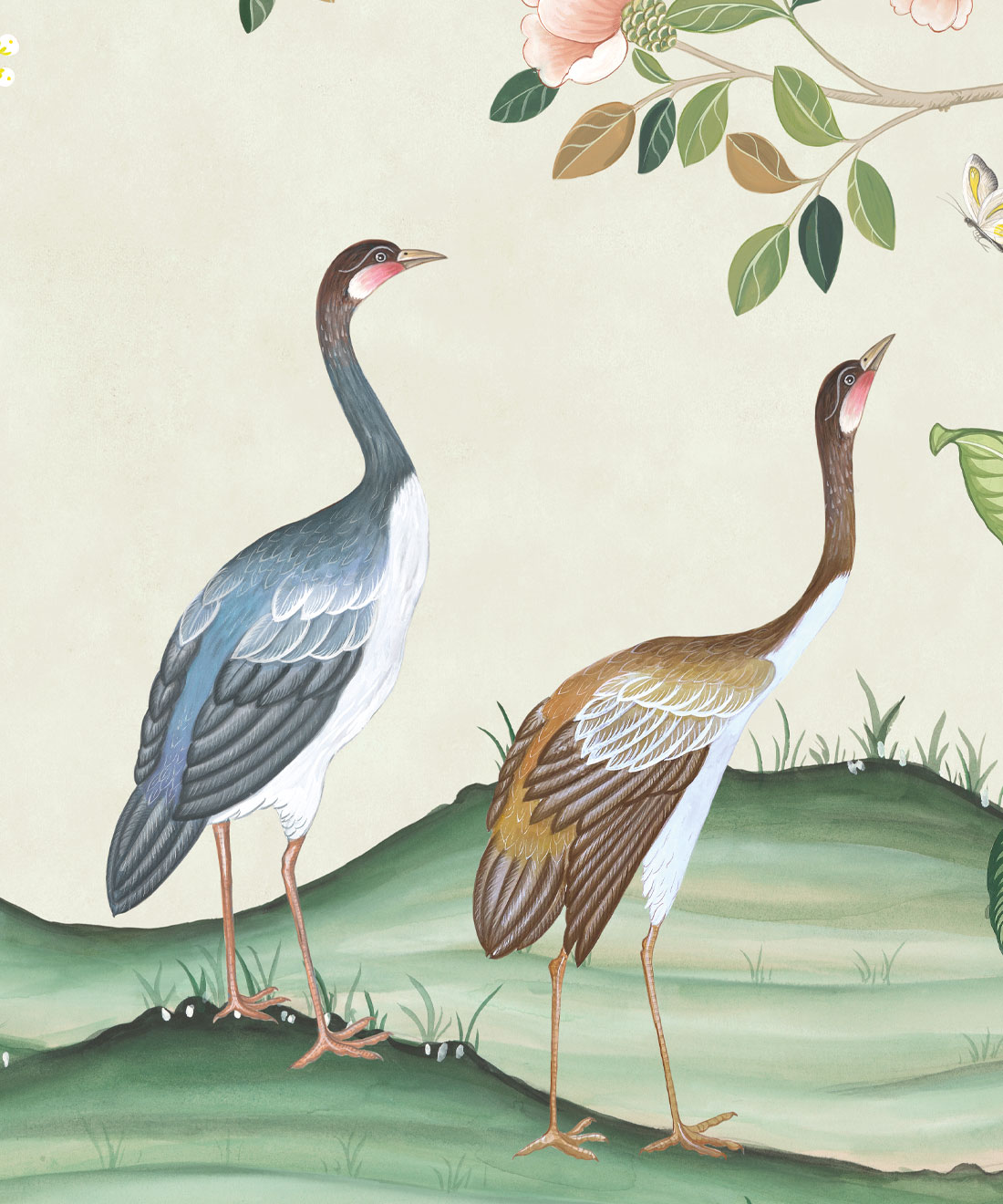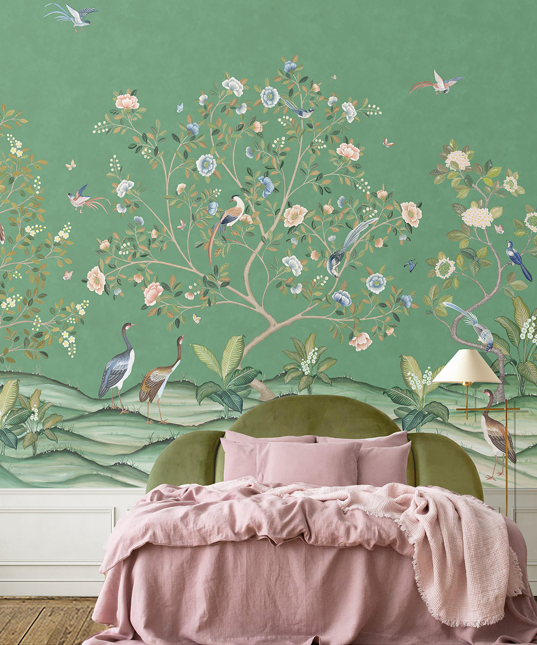 The Spring Landscape Mural from Bethany Linz is a Chinoiserie-style mural originally hand-painted in Gouache on stone henge paper. Inspired by a commission piece, the design allowed the artist to undertake a unique challenge featuring birds, butterflies, and botanicals. The six-panel mural captures the height of spring, when flowers are in full bloom and the various birds and butterflies are out to enjoy them. This design is a beautiful floral backdrop, perfect for an open living space, bedroom, or child’s playroom.