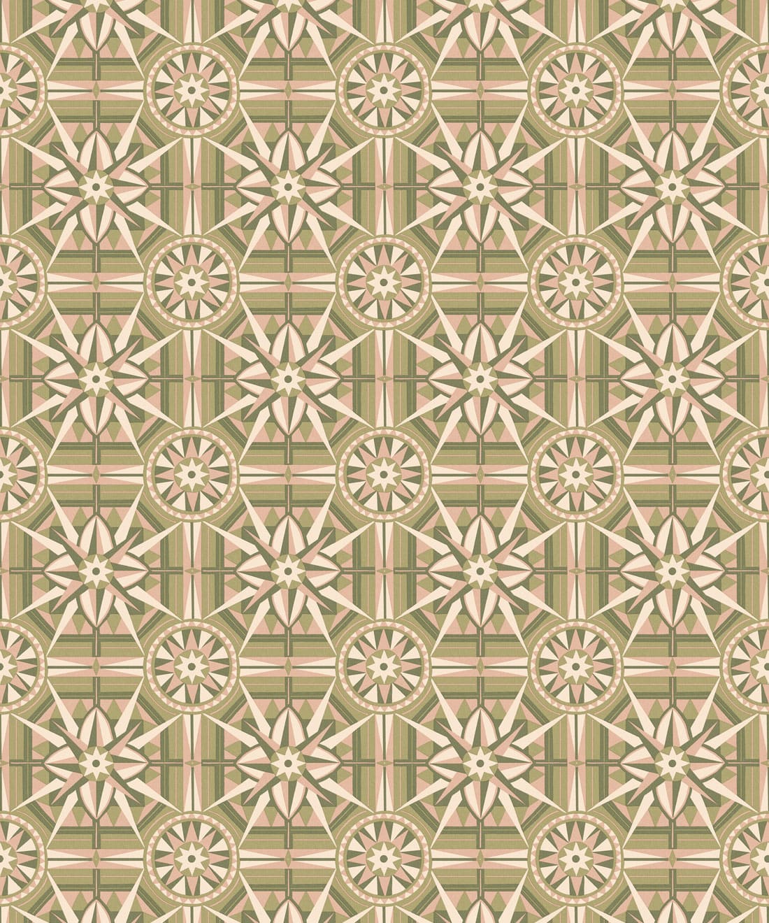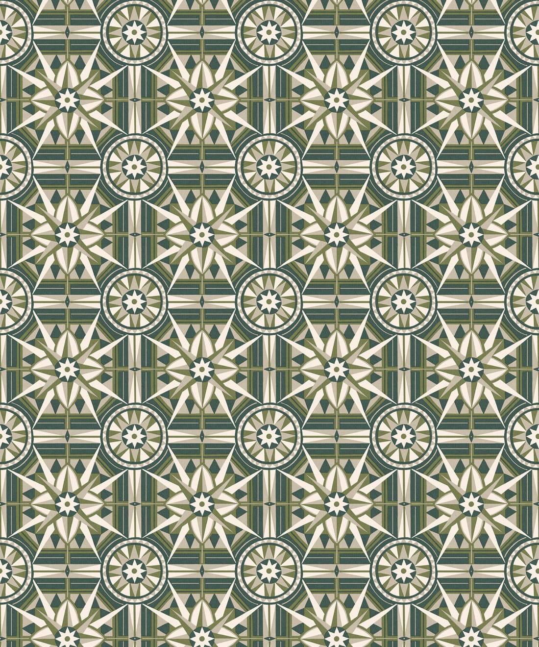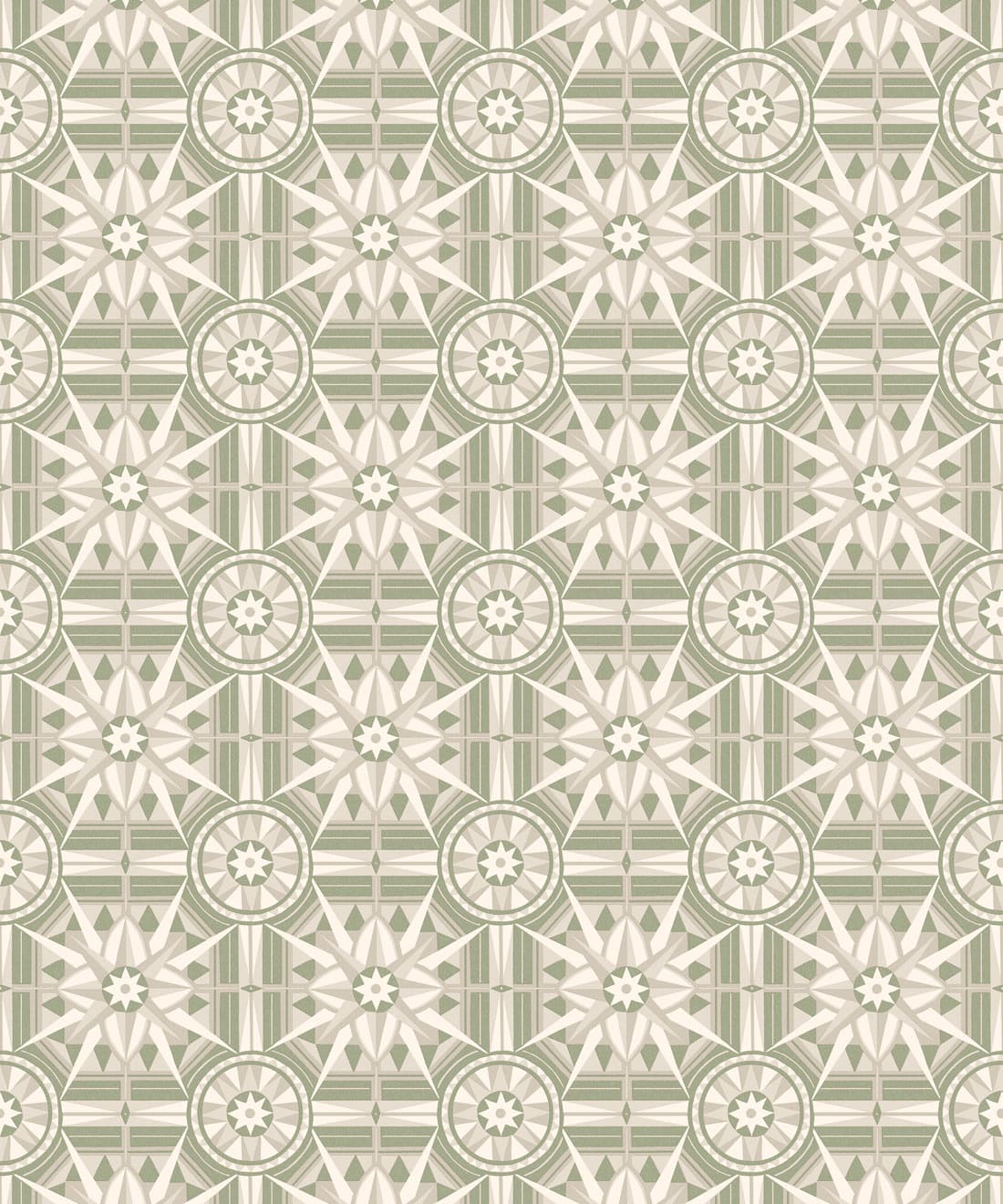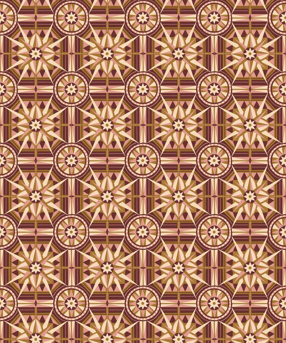Sundial is a geometric wallpaper inspired by Victorian floor tiles and the symmetrical forms of traditional garden sundials. Bold shapes radiate outward to form a confident repeating pattern.
