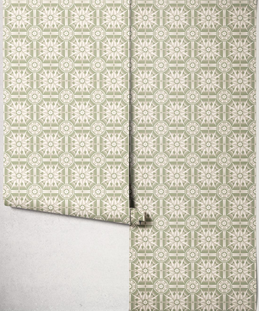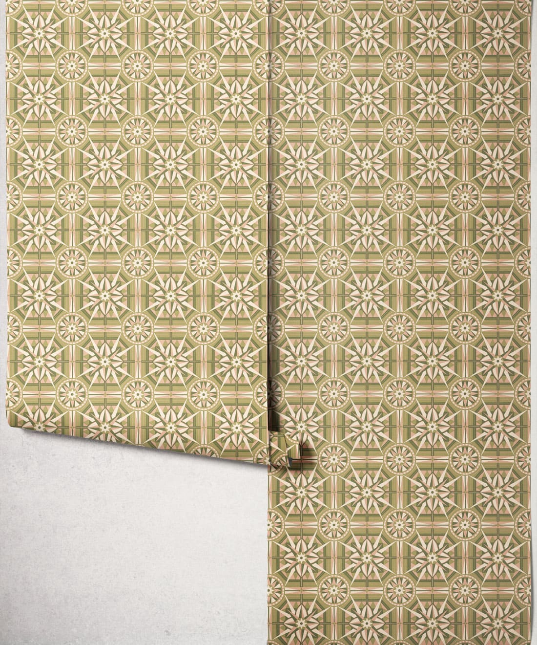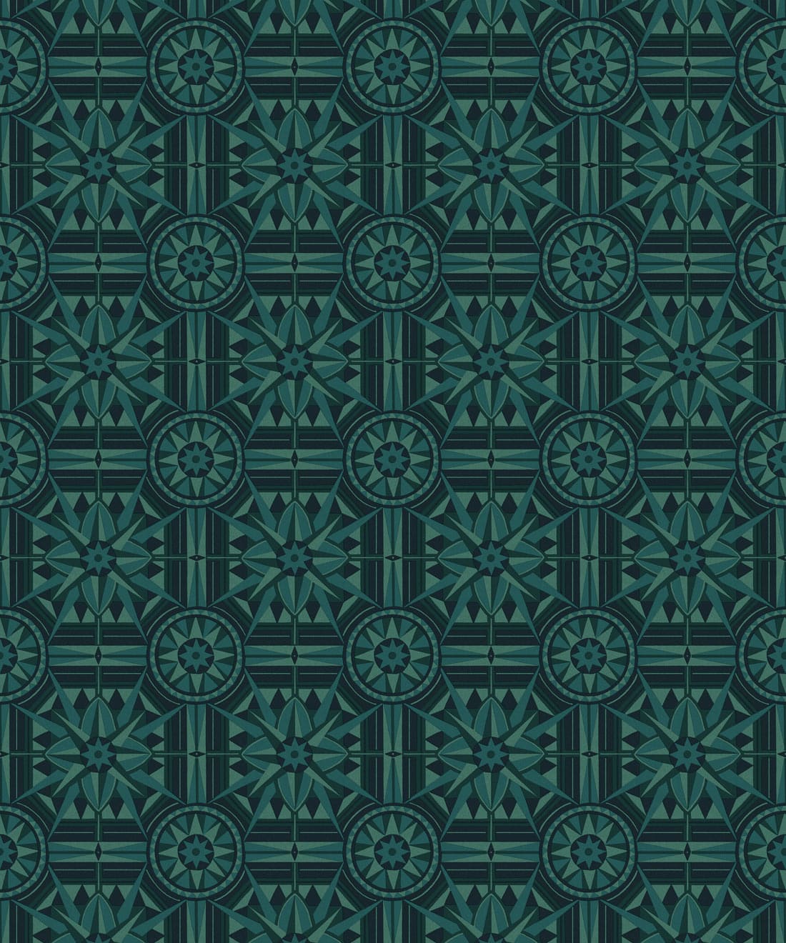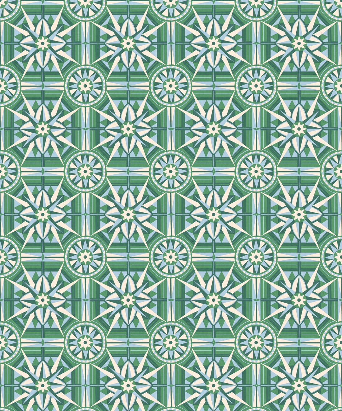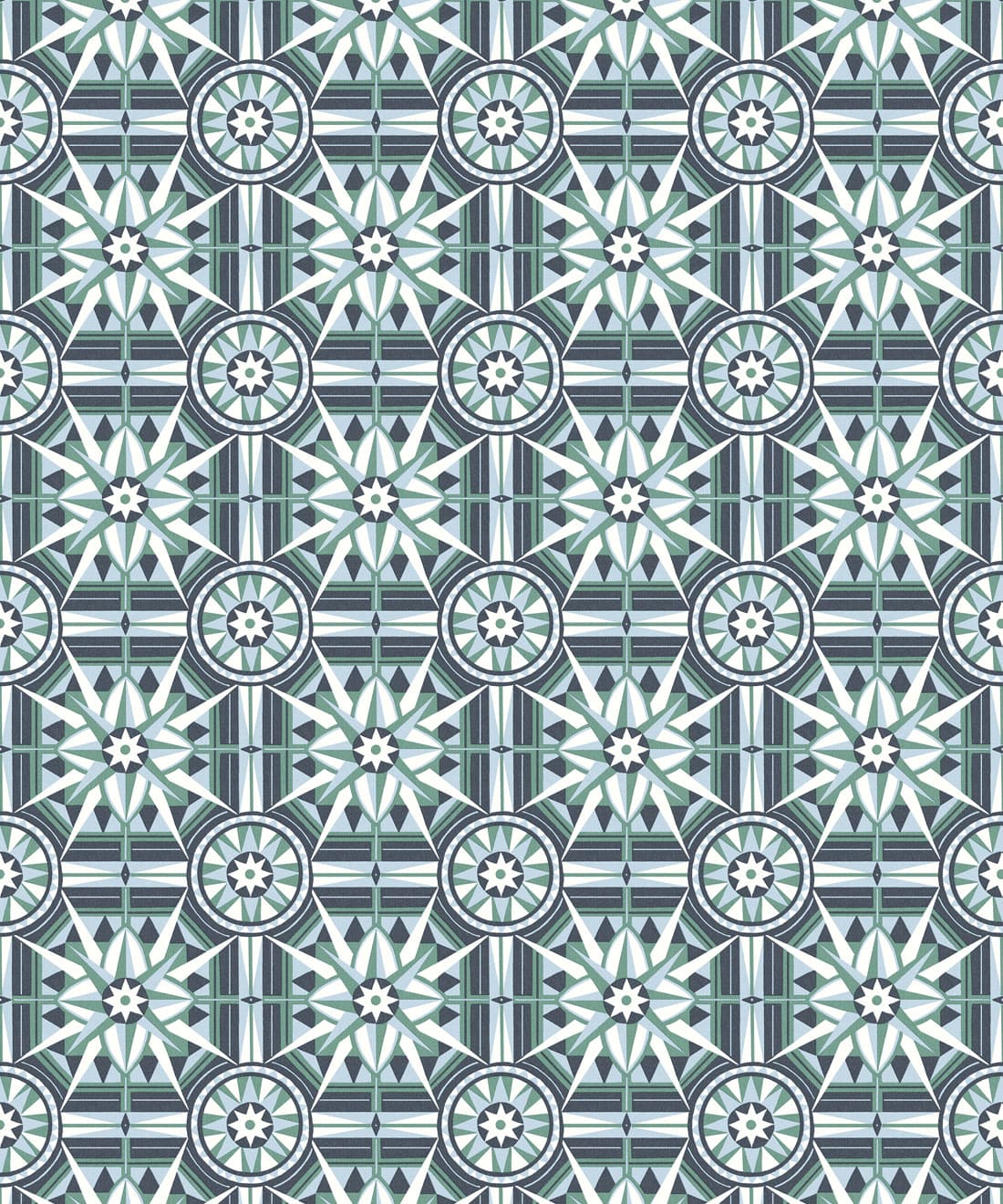 Sundial is a geometric wallpaper inspired by Victorian floor tiles and the symmetrical forms of traditional garden sundials. Bold shapes radiate outward to form a confident repeating pattern.