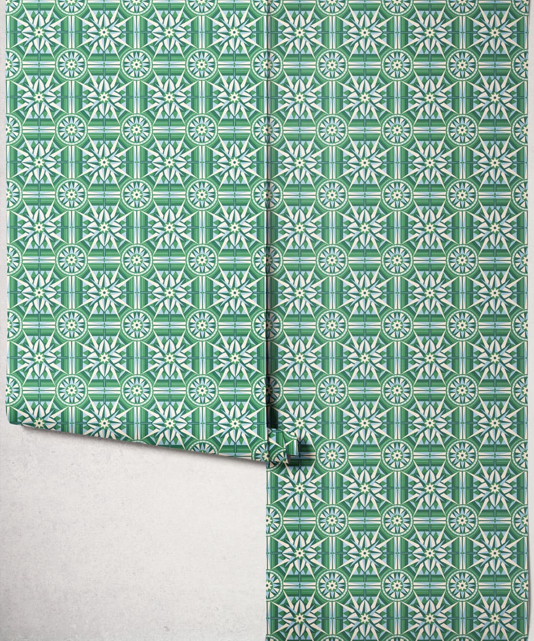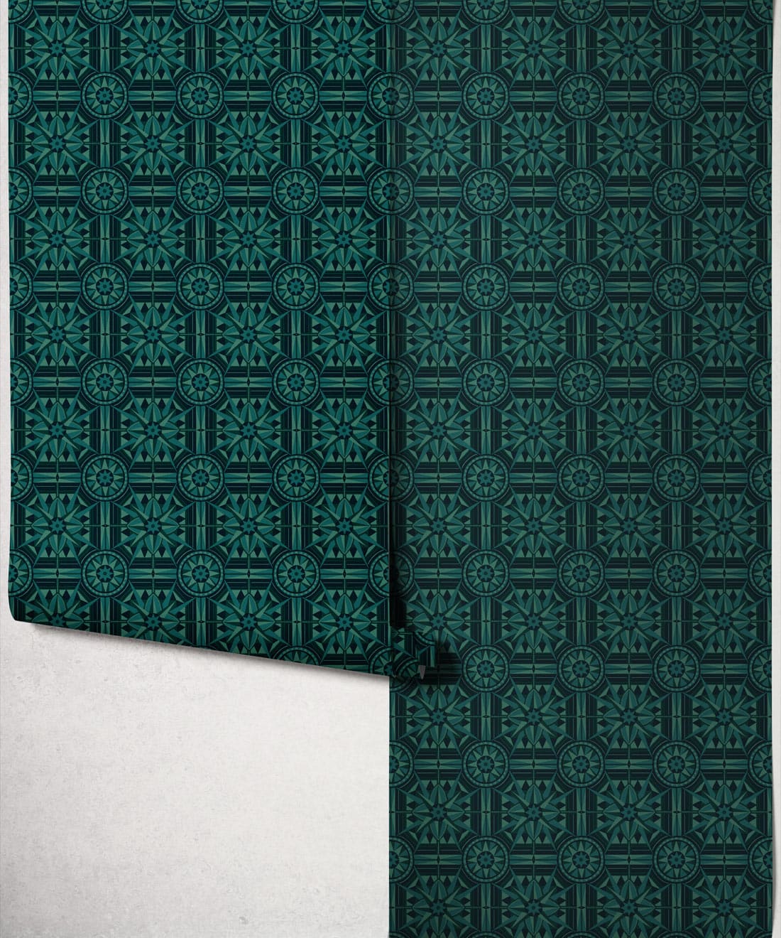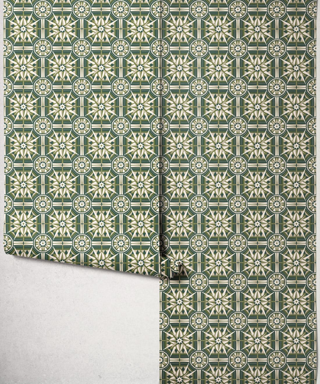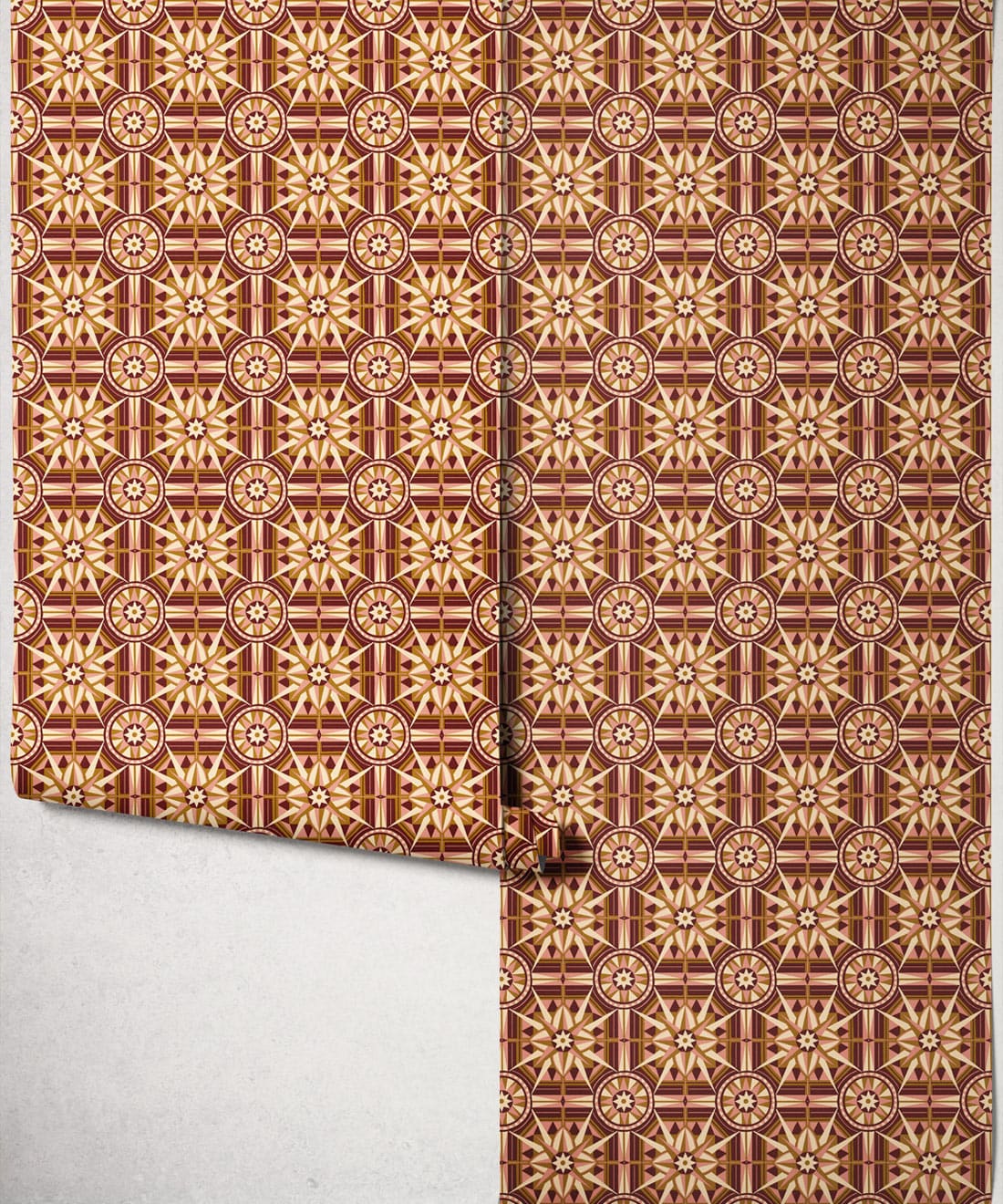 Sundial is a geometric wallpaper inspired by Victorian floor tiles and the symmetrical forms of traditional garden sundials. Bold shapes radiate outward to form a confident repeating pattern.