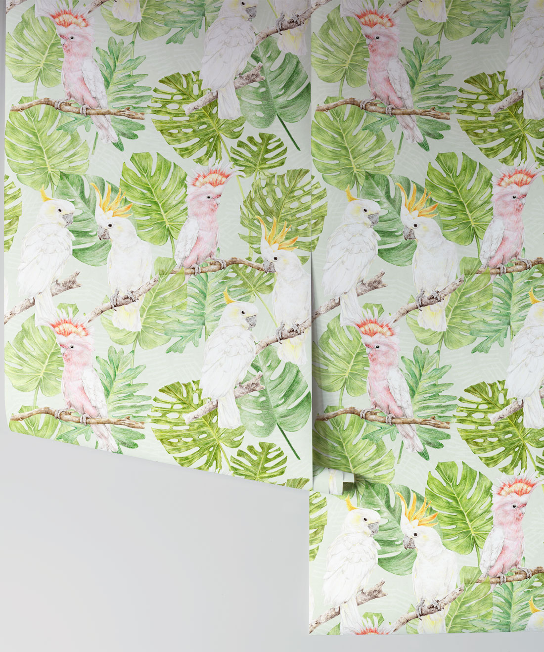 Birds of a feather flock together. This wallpaper design is a celebration of the Australian bird and the tropical climate, featuring a flock of cockatoos perched among a canopy of leaves and branches.