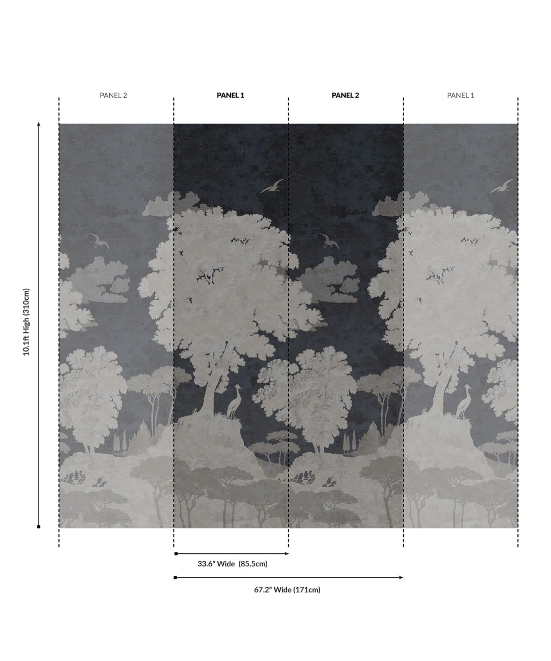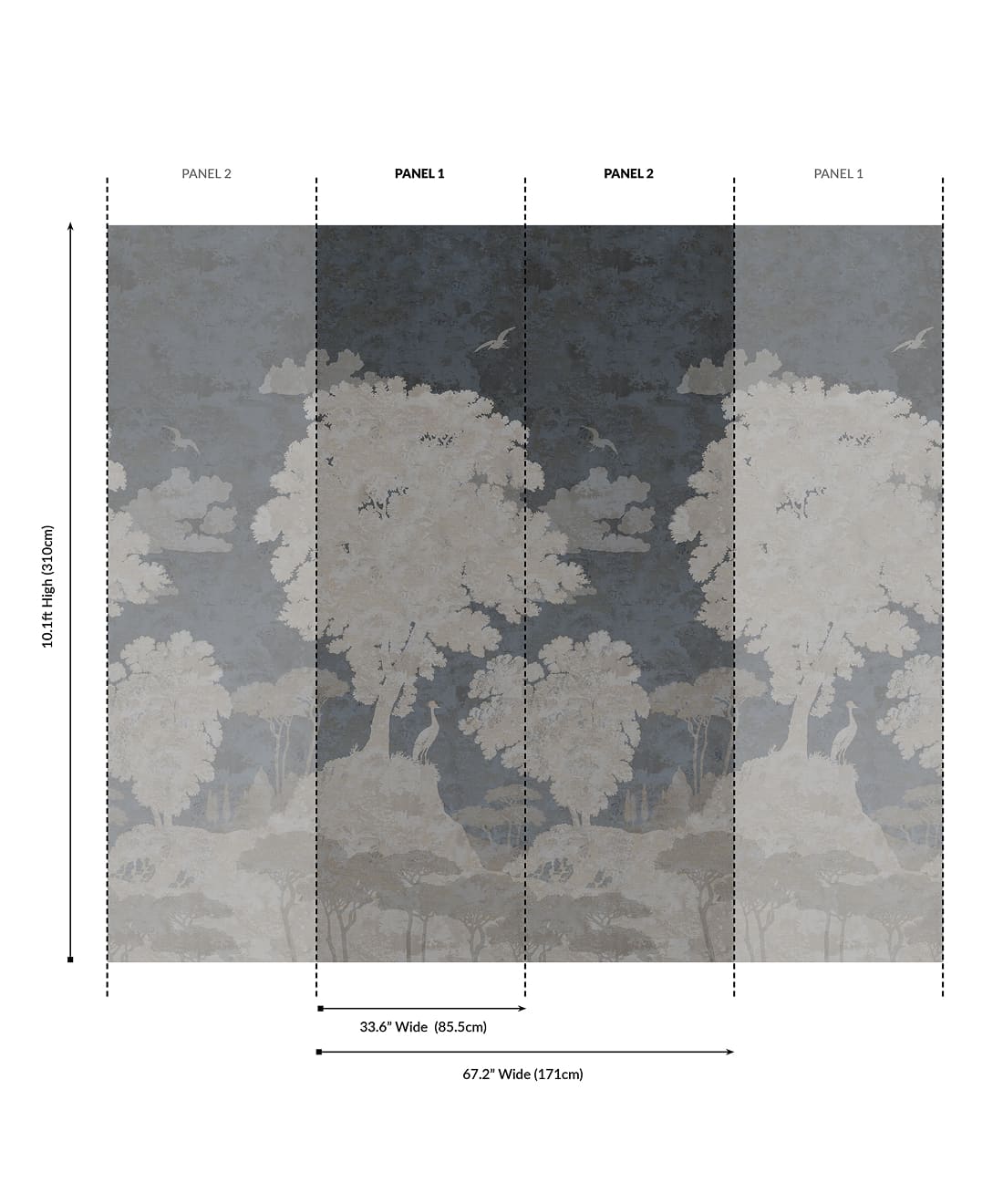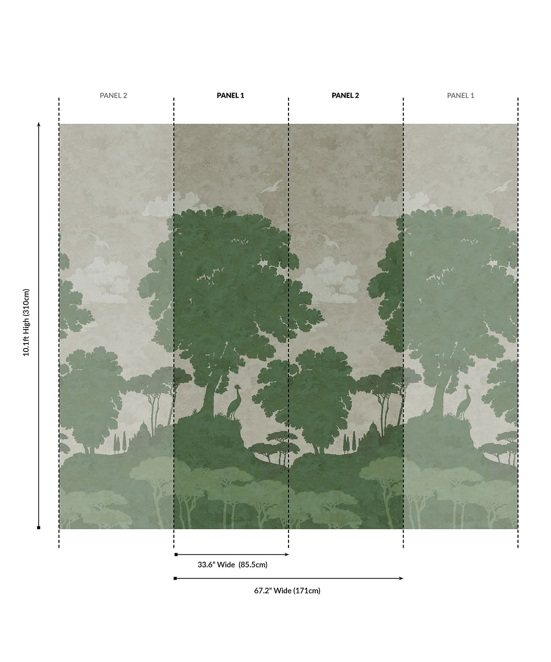 Designed as panels that are 33.6″ (85.5cm) wide x 10.1ft (310cm) high.