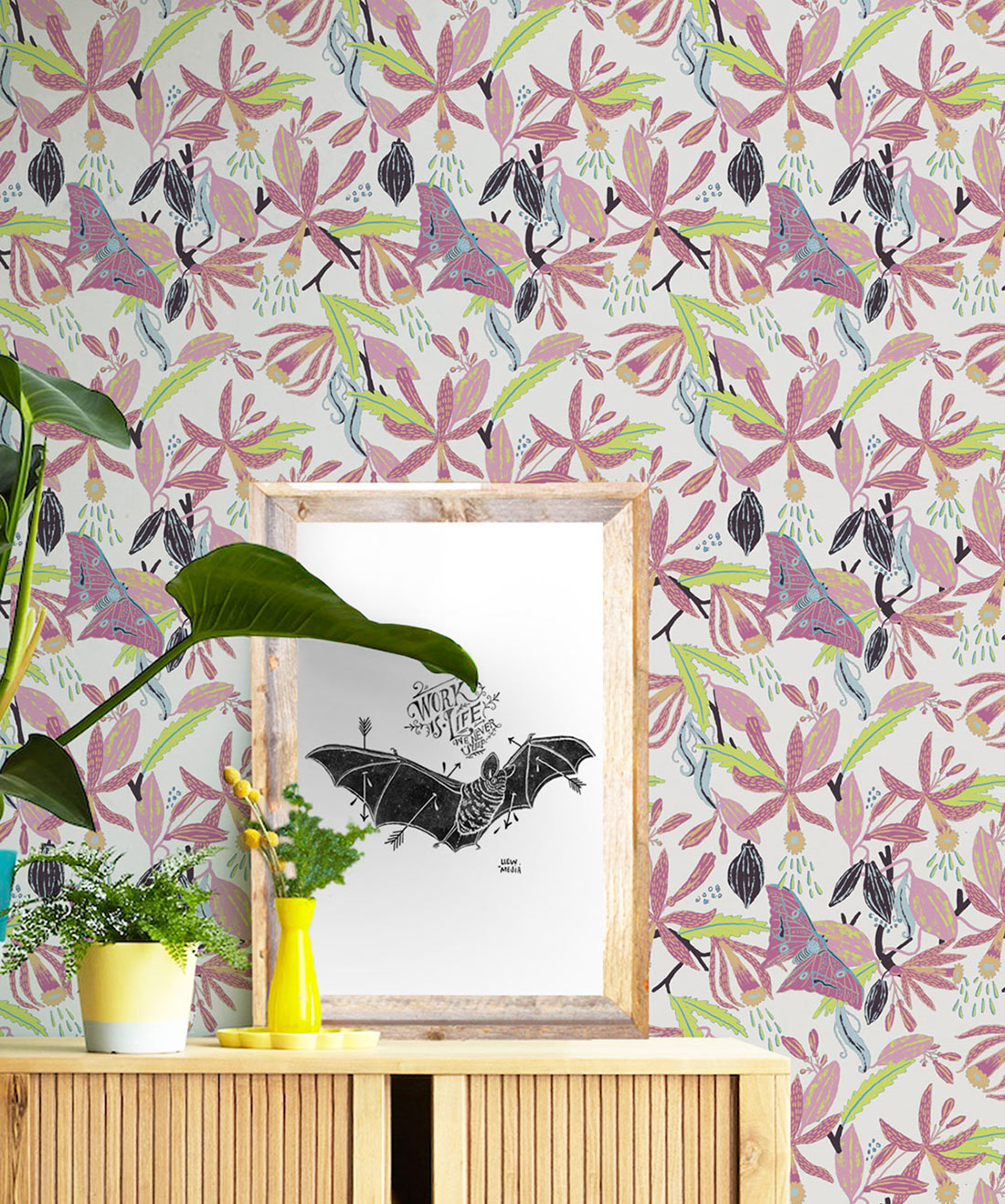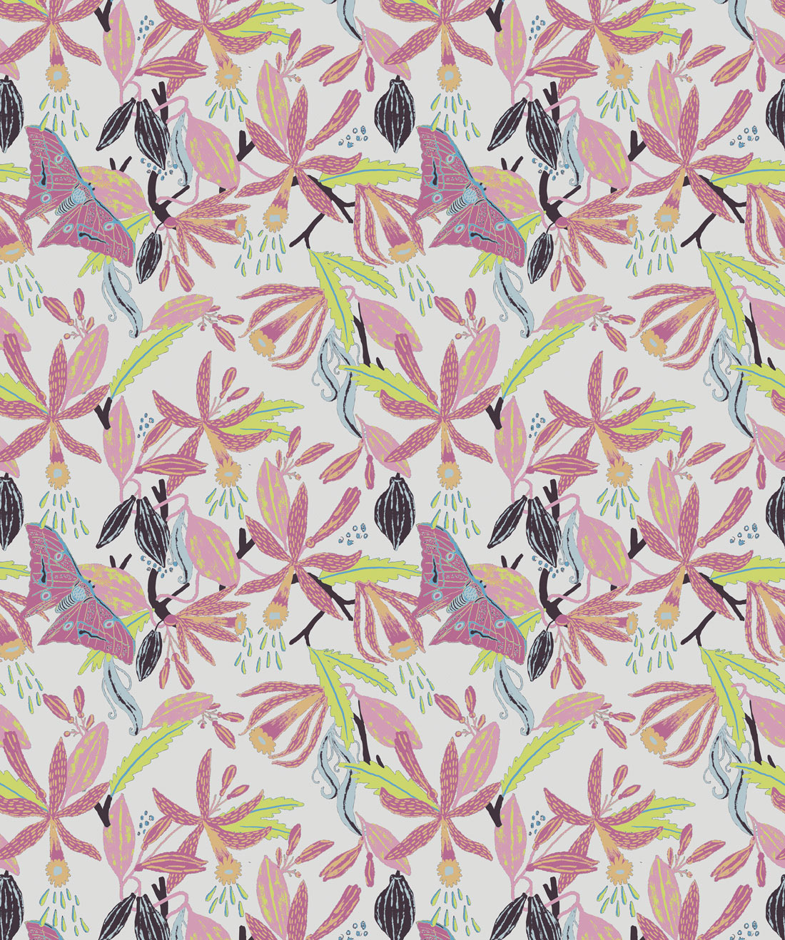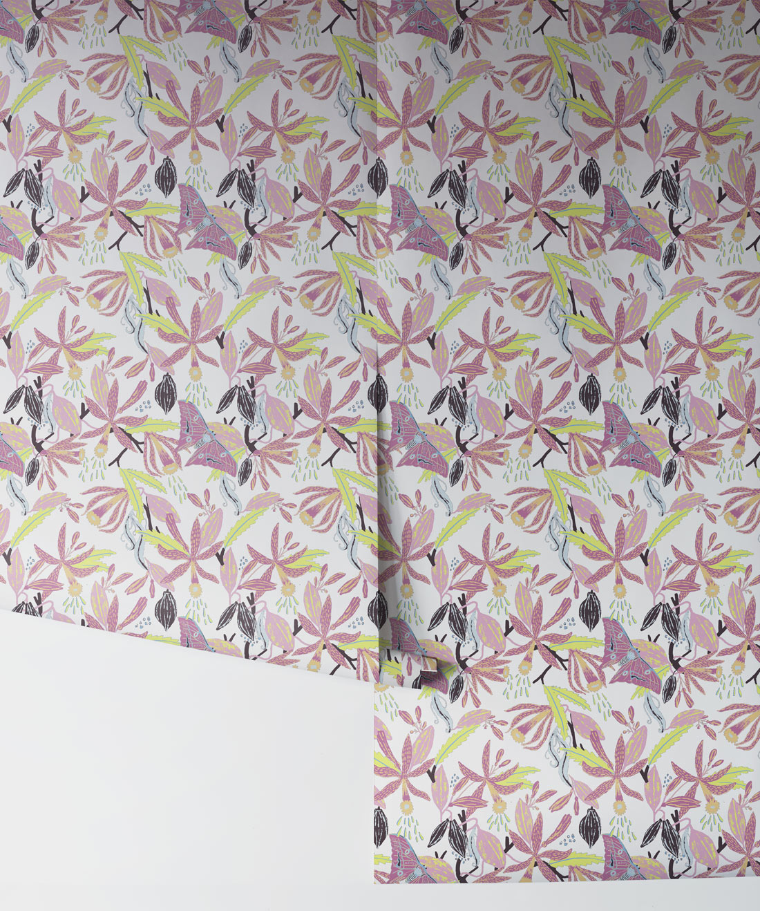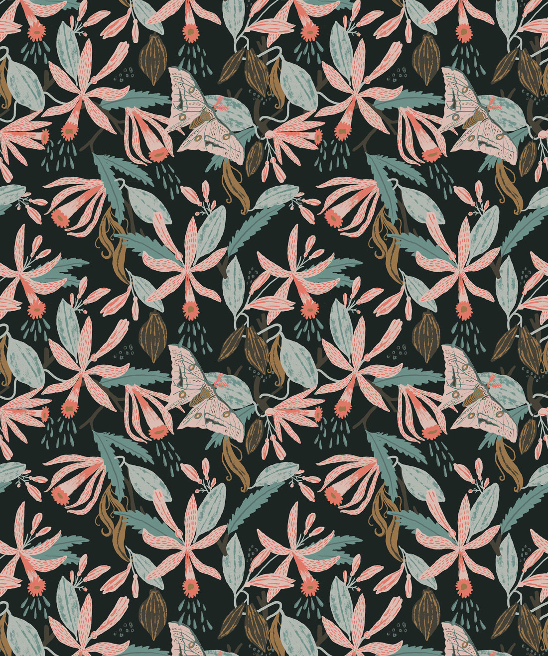 A fresh jungle wallpaper design with bugs created in collaboration with Llewellyn Mejia, a talented stylistic illustrator with an international portfolio. Like the curious moth lured to investigate the secret scent of the hanging vanilla bean, your eyes will travel among the intricacies of this splendid creation of curious blooming flora and ripening vanilla beans that is guaranteed to be a tasty treat for any interior space.