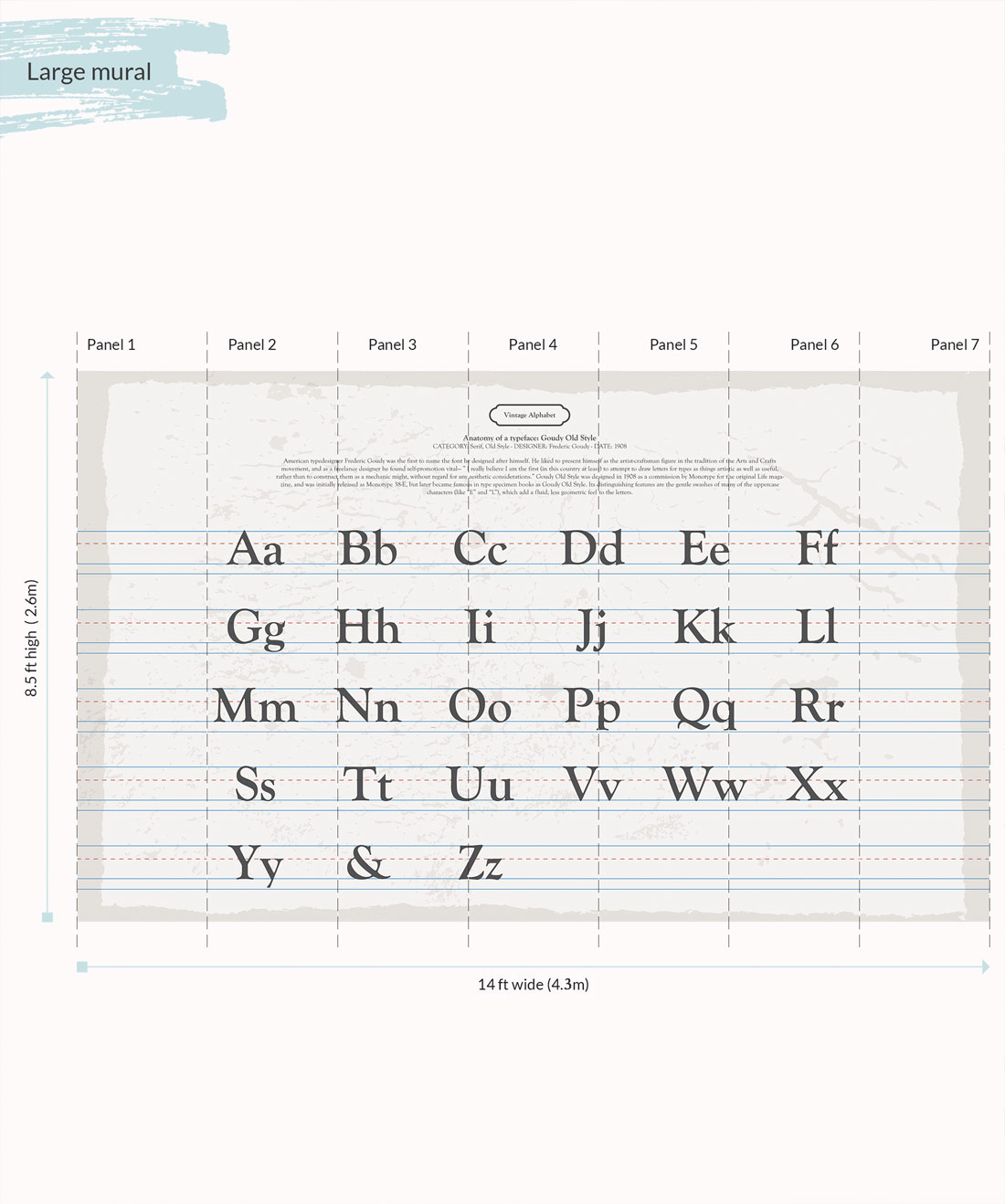 The perfect educational wall mural for you children. This design would perfectly suit a kindergarten, day care centre of a kid’s bedroom. Learn the abc’s with the style, elegance and hardiness of Goudy Old Style Font. With round curves and thin strokes, Goudy Old Style brings a little gentle humanity to this educational wall mural that might look to austere in a more workday typeface.
