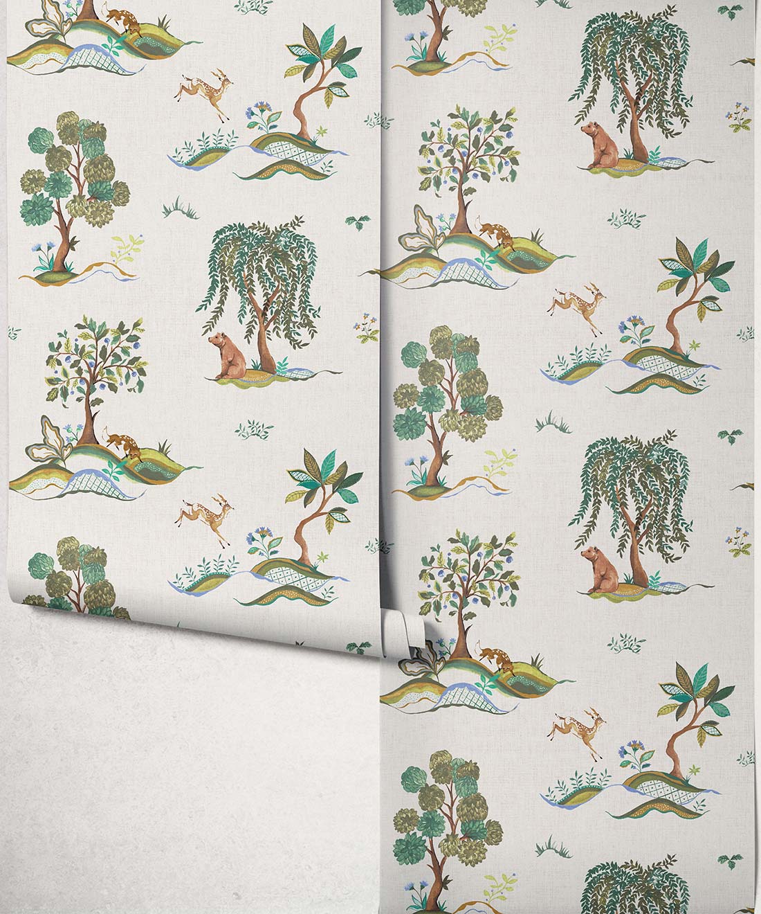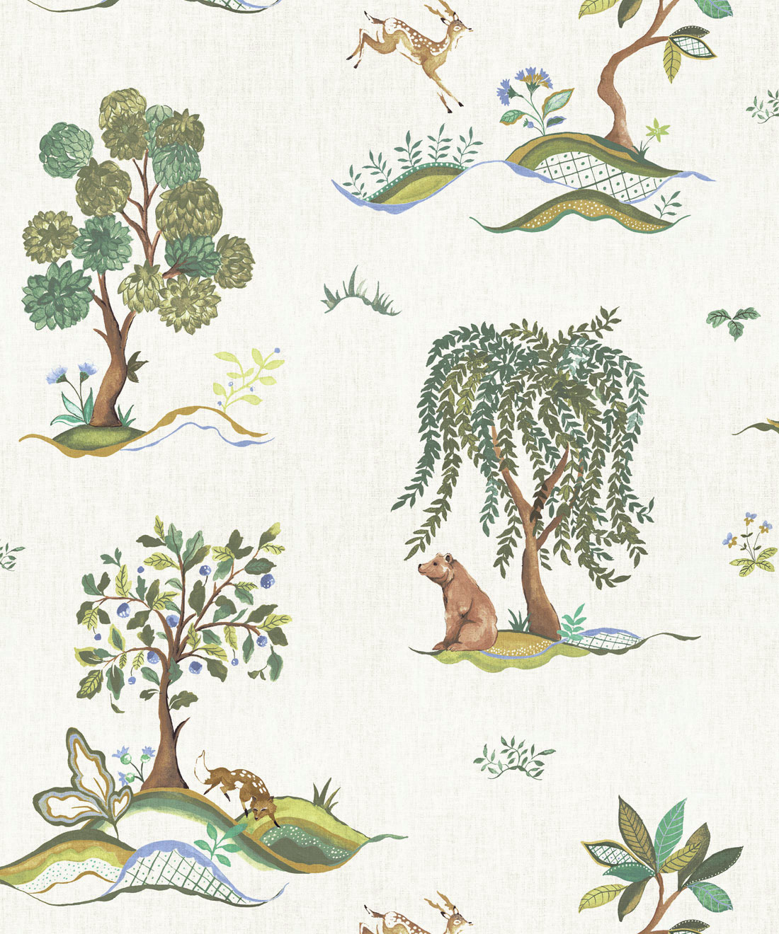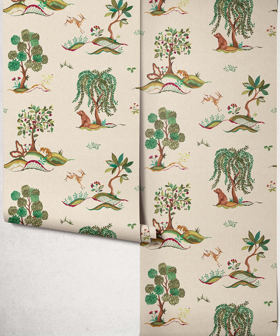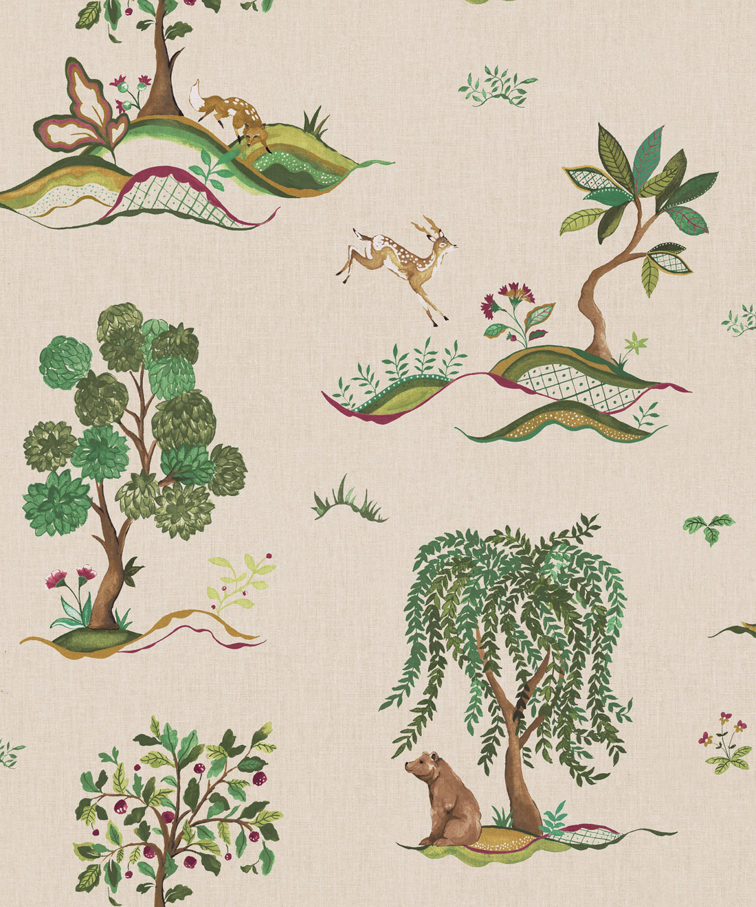 Willow Wood Decorative Textile Wallpaper is a toile inspired woodland wallpaper influenced by the intricate storytelling of 17th century Jacobean embroidery. Hand painted trees and winding foliage unfold across the design, creating an illustrative pattern with a gentle storybook character.