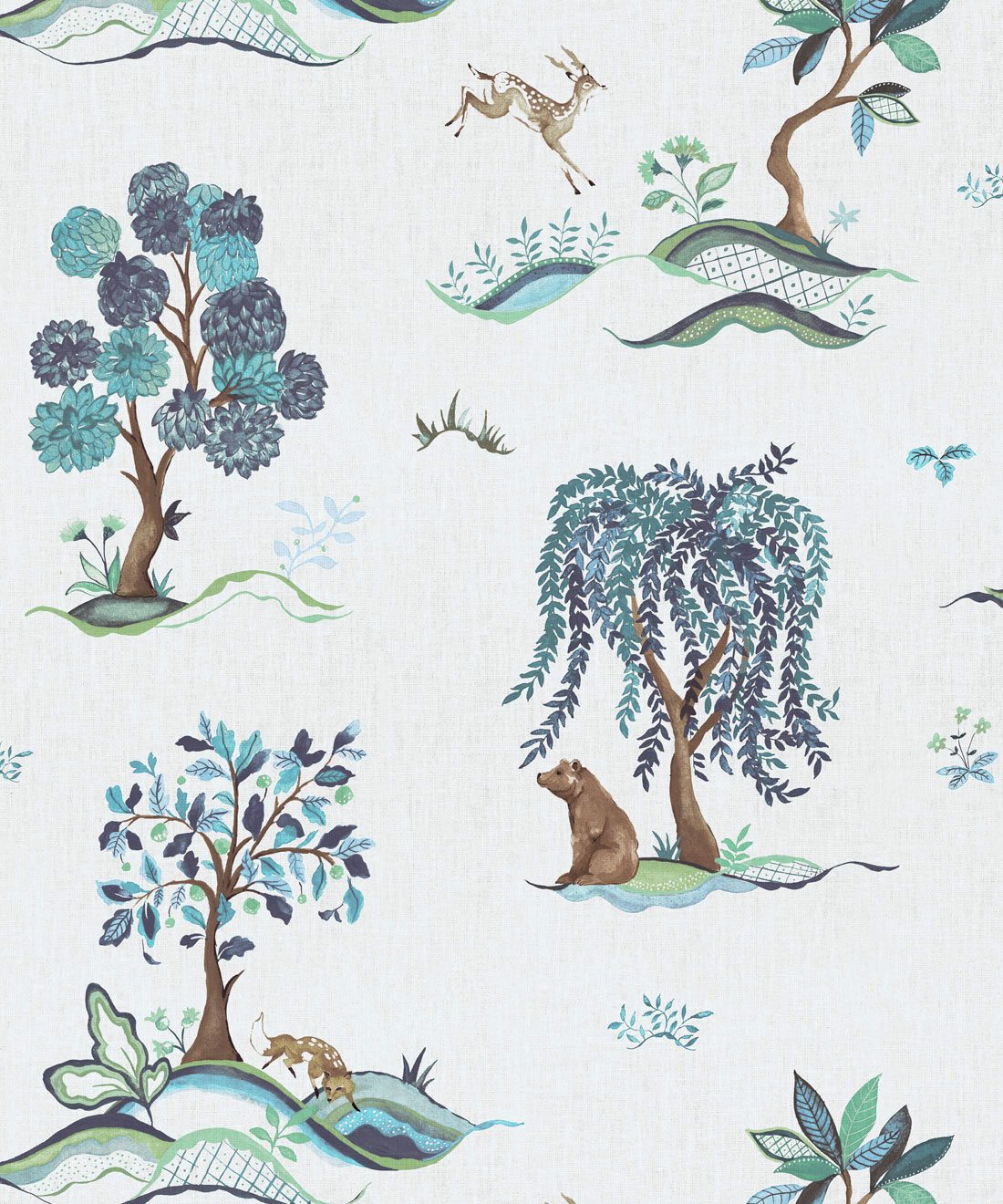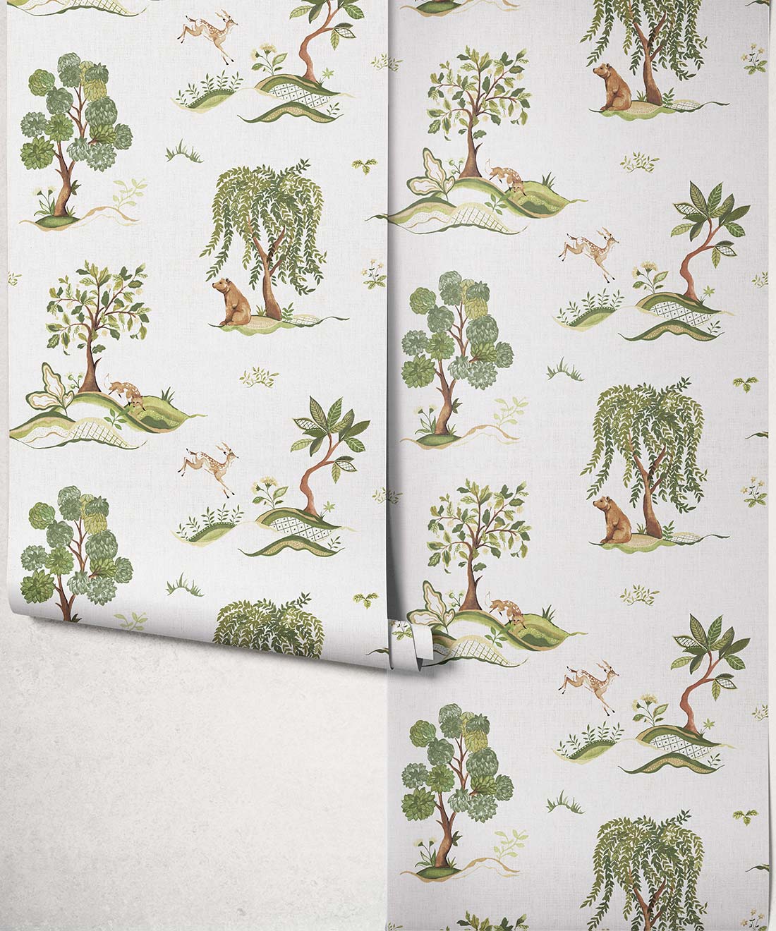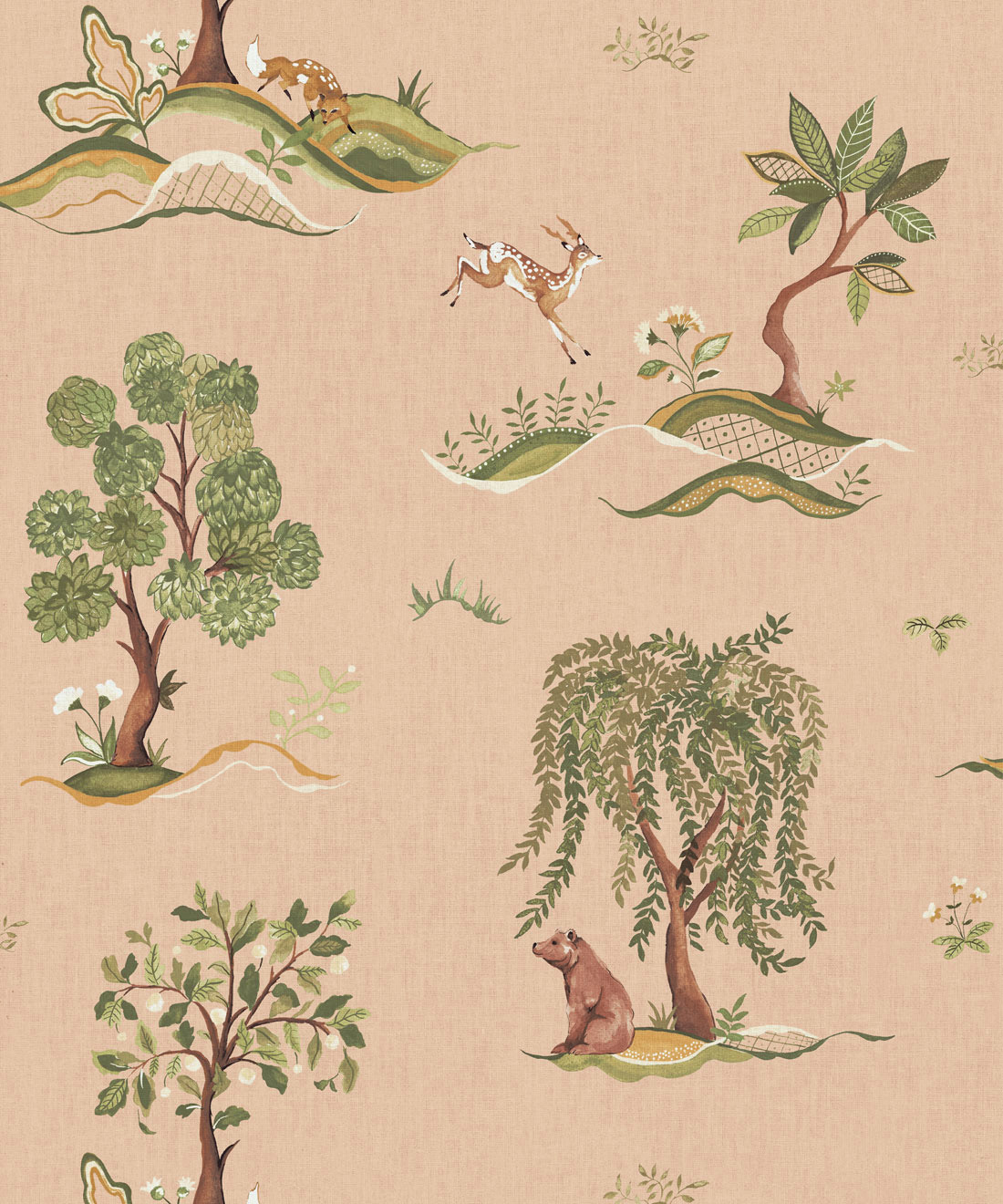 Willow Wood Decorative Textile Wallpaper is a toile inspired woodland wallpaper influenced by the intricate storytelling of 17th century Jacobean embroidery. Hand painted trees and winding foliage unfold across the design, creating an illustrative pattern with a gentle storybook character.