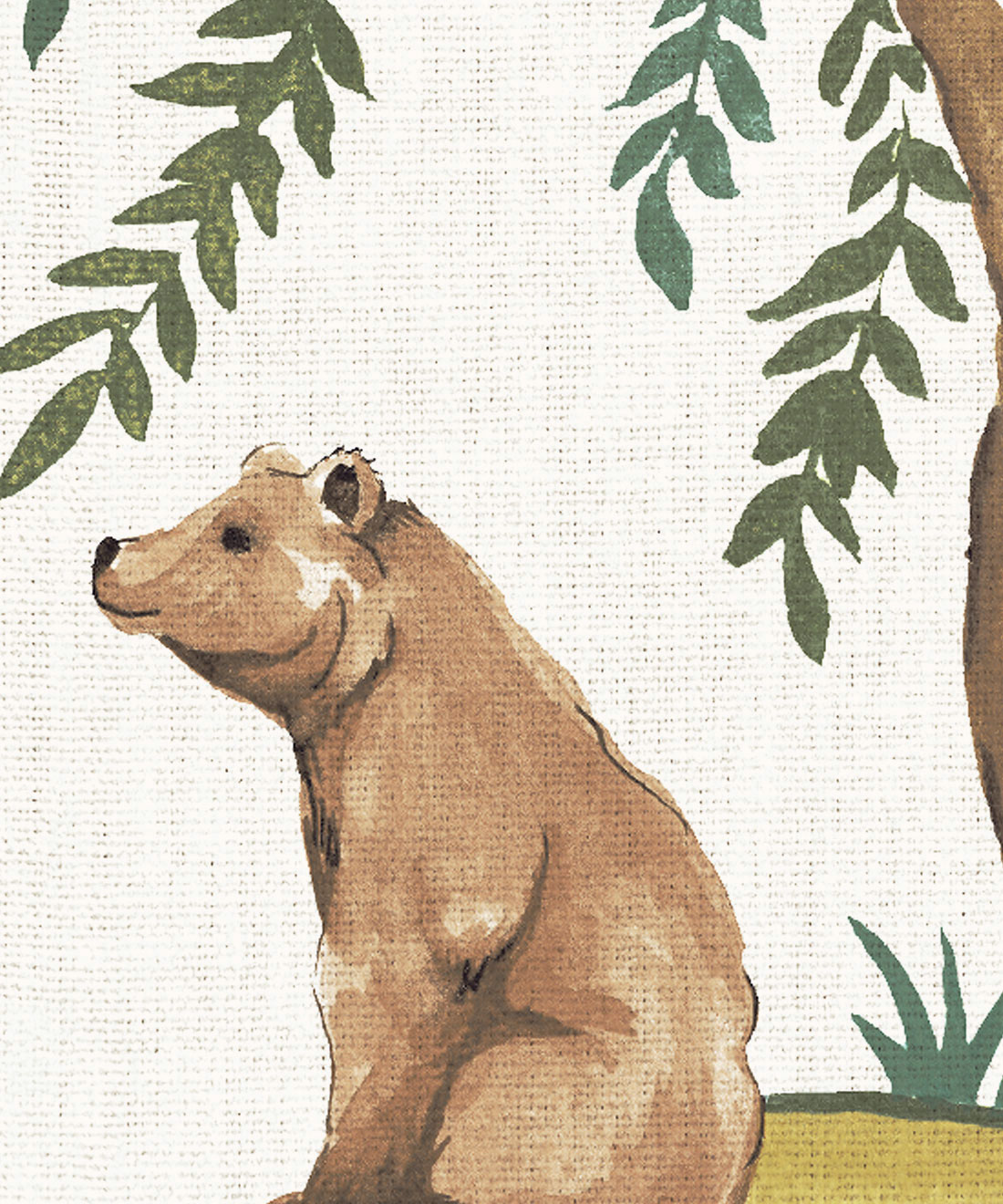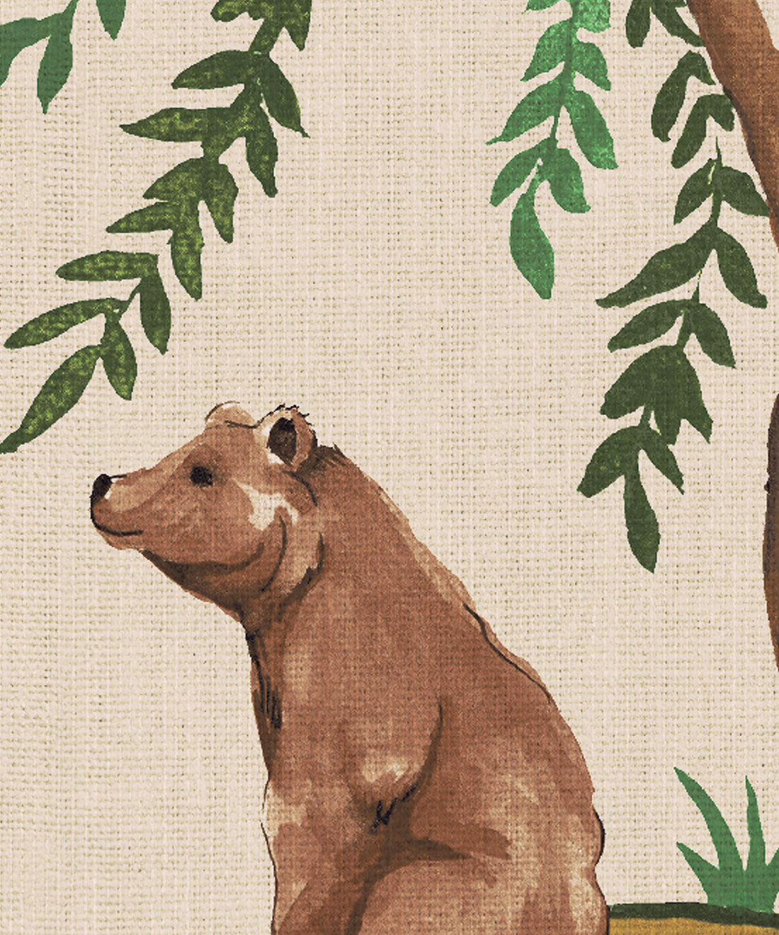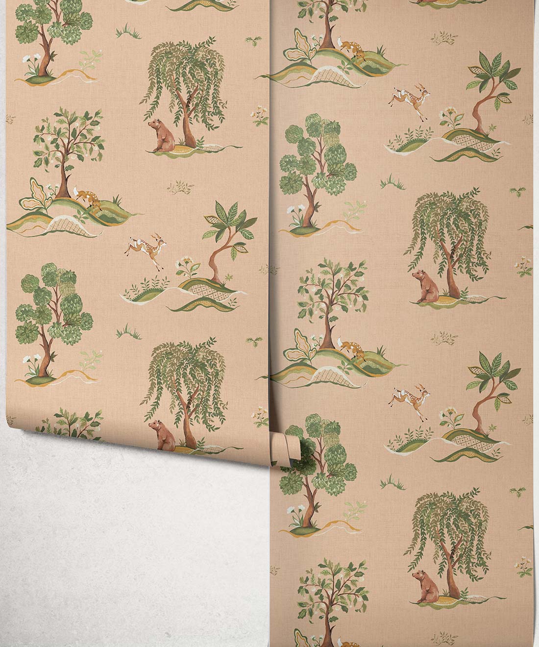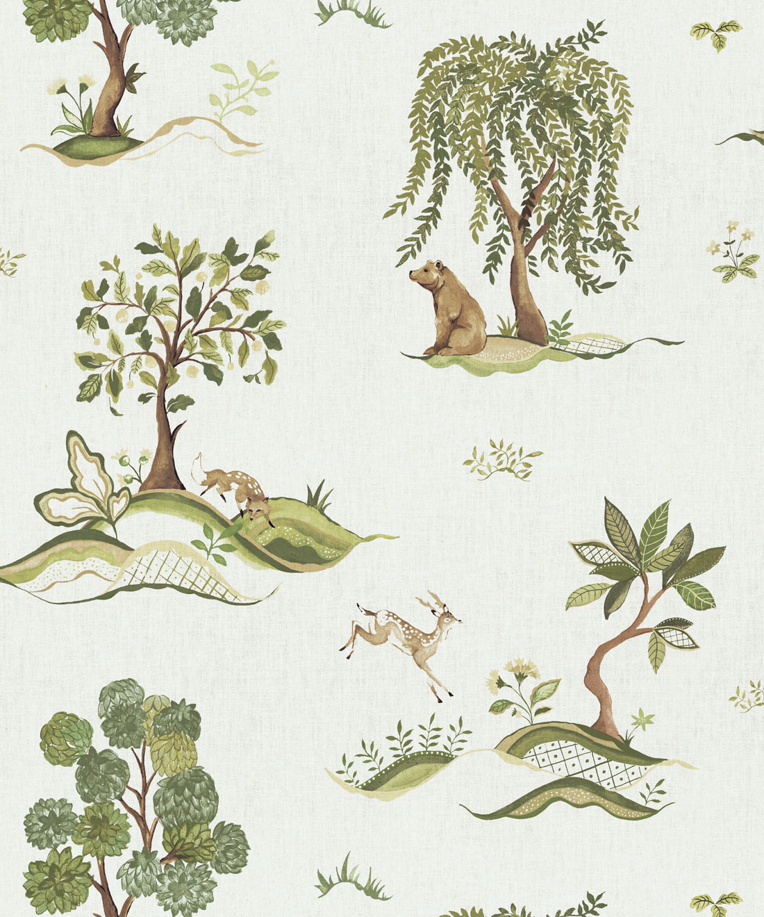 Willow Wood Decorative Textile Wallpaper is a toile inspired woodland wallpaper influenced by the intricate storytelling of 17th century Jacobean embroidery. Hand painted trees and winding foliage unfold across the design, creating an illustrative pattern with a gentle storybook character.