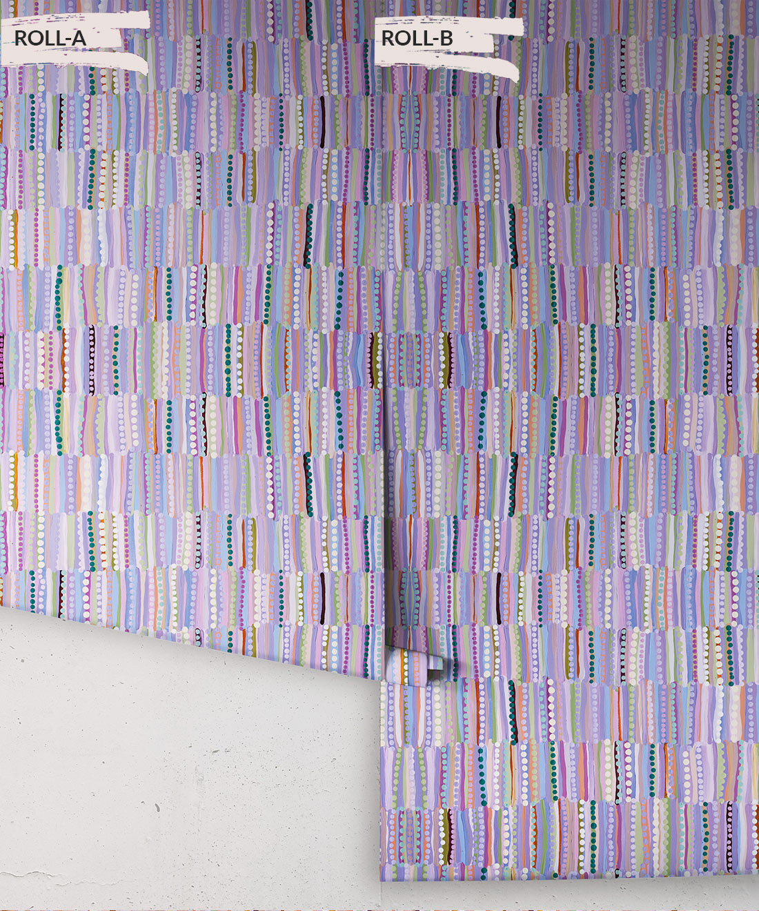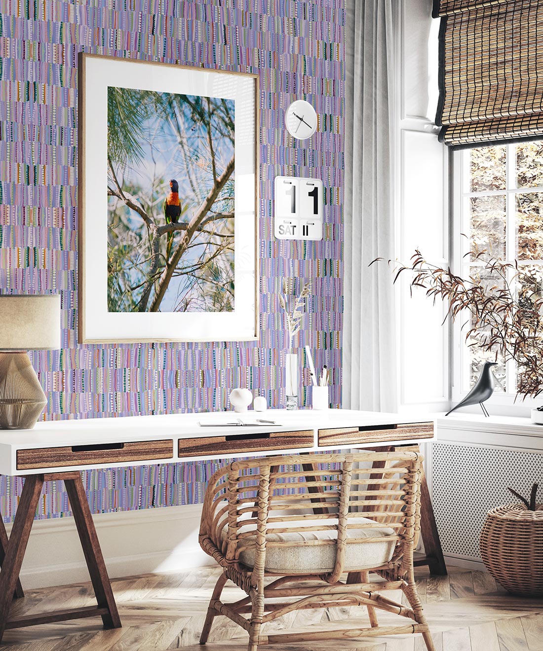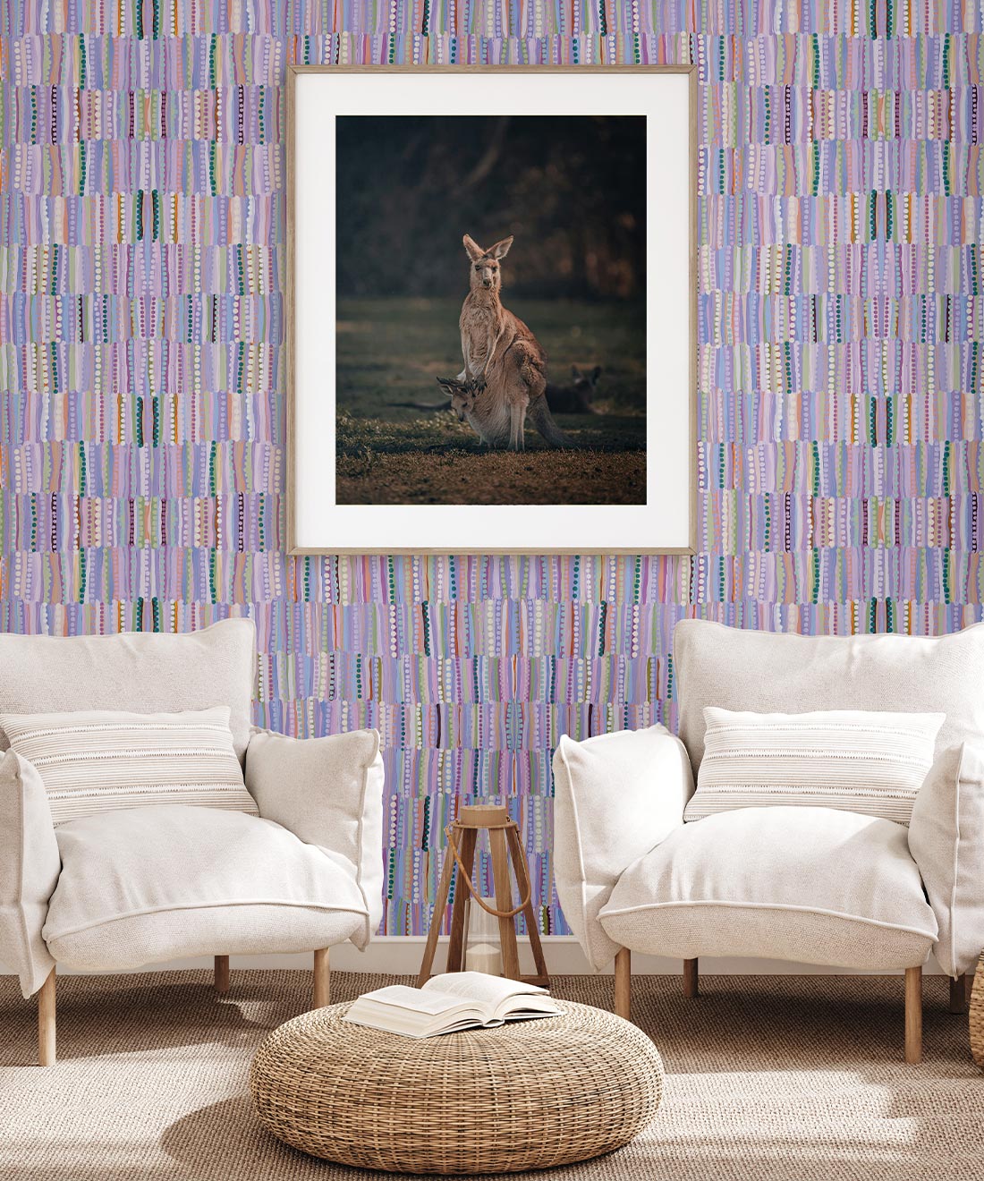 ‘Rainbow Sun Shower’ – immerse your space with the vibrant beauty of our Yuluwirri Sun Shower wallpaper from Emro designs. Inspired by the radiant colours of a rainbow emerging after a storm, this design captures the dynamic transition from stormy skies to serene twilight. The rich purples creates a sense of calm and elegance, making it perfect for spaces where you want to evoke a peaceful yet uplifting atmosphere. Transform your home with the magic of a rainbow-lit twilight shower with this unique design from Gomeroi artist Bri Chelman.